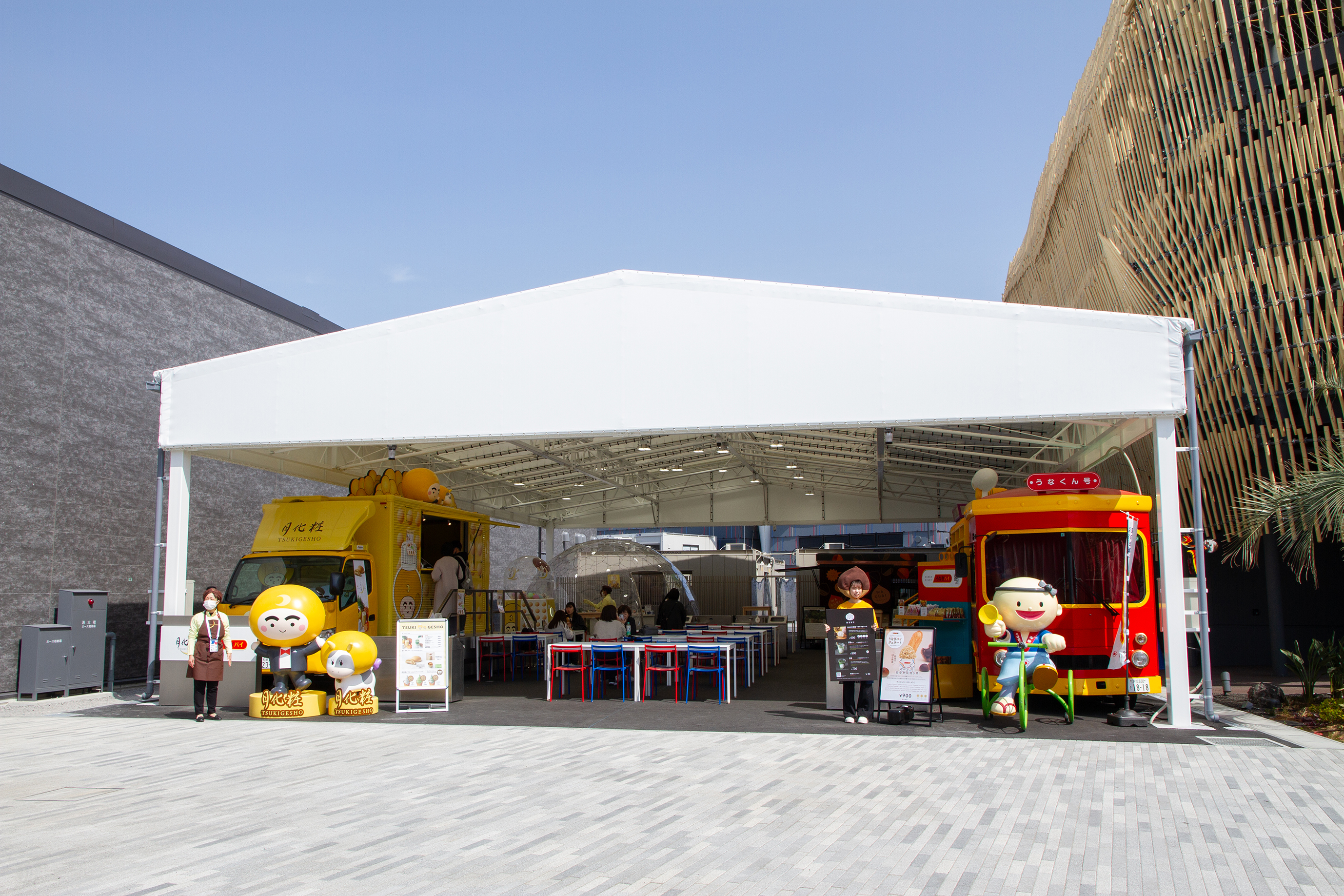 東ゲートを通り大屋根リングの内側に入って3軒目、マレーシアパビリオンとコモンズ -A 館の間に「月化粧 × うなぎパイ 大阪・関西万博店」があります。こちらは大阪名物「月化粧」と静岡名物「うなぎパイ」のコラボ店。左側には月化粧のキッチンカー、右側にはうなぎパイのキッチンカーがあり、中央には購入した物を食べることができるスペースがあります。