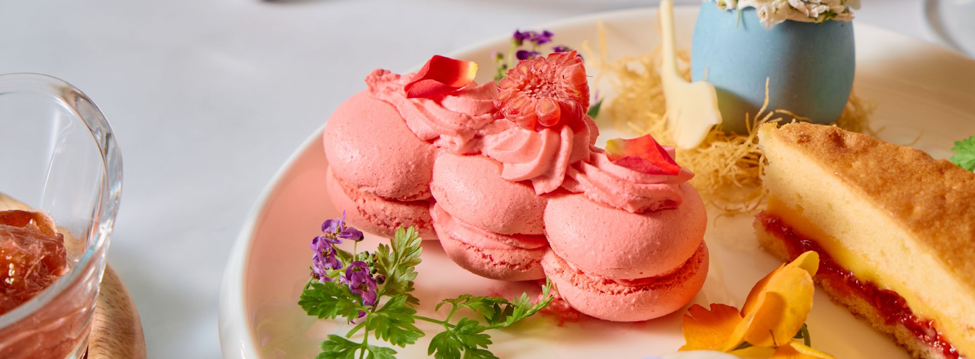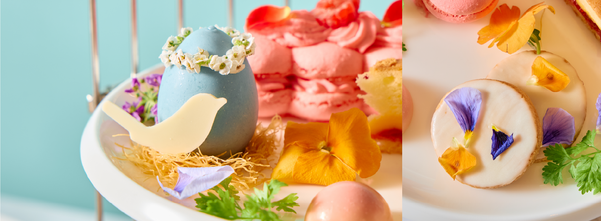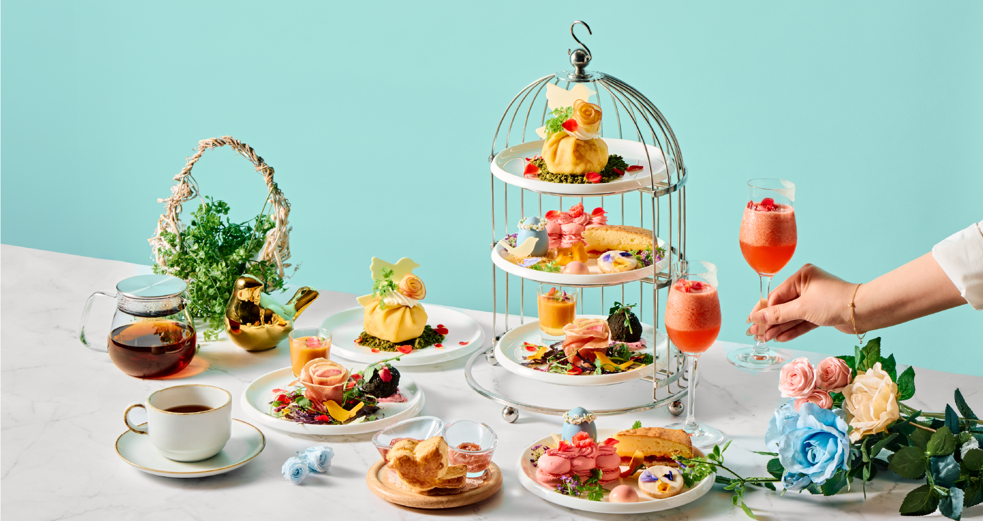 今年は、アクアブルーやピンク、イエローなどパステルカラーを基調に心躍る見た目に仕上げ、鳥かごをイメージした3段のスタンドに、スイーツ6品とセイボリー3品をのせ、さらに2種のジャムを添えたスコーンプレートと特製モクテルをお楽しみいただけます。「voco」ブランドのシンボルでもある“小鳥”をモチーフとしたスイーツを随所に散りばめ、人気の自家製スコーンが小鳥型になり初登場。アプリコット、ベリー、マンゴーなどとバラを組み合わせ、一品一品異なる味わいをお楽しみいただけます。