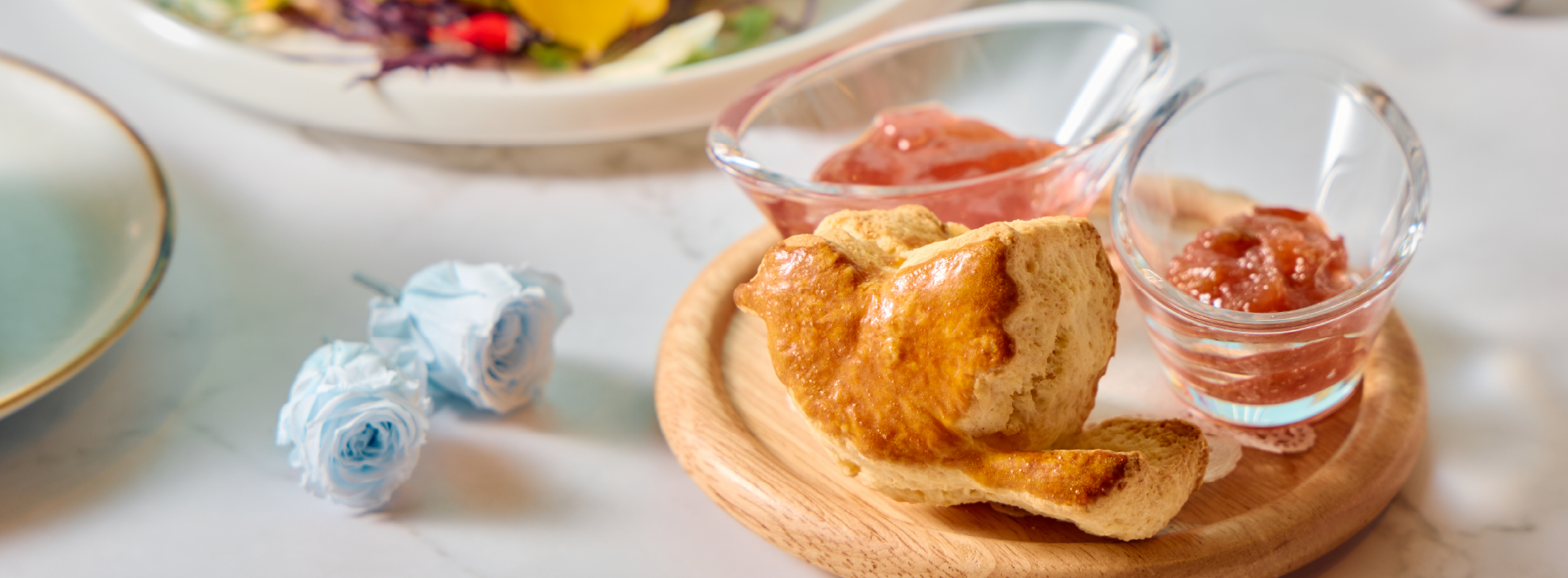 遊び心あふれることり型のスコーン。尻尾のカリッとした食感と、上部のサクッとしつつもほろほろとした食感のコントラストが絶妙です。別添えのローズジャムの上品な香りと、ルバーブジャムの爽やかな酸味は、それぞれ味わうのも、2つ一緒に重ねて新たな味の発見を楽しむのもおすすめです。