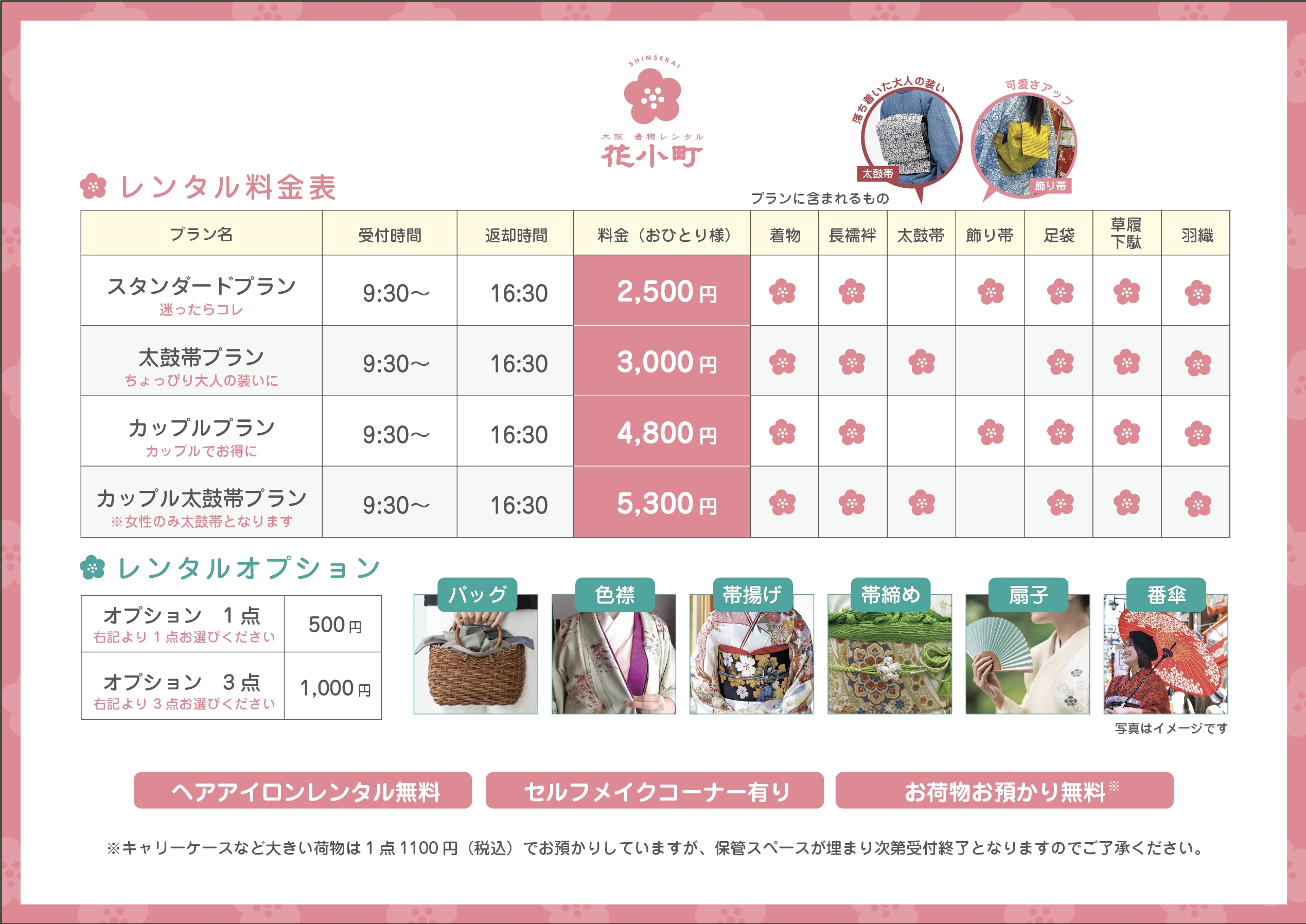 新世界は、通天閣をはじめとする大阪を象徴する観光スポットであり、昭和レトロな街並みや活気ある食文化で国内外の観光客に親しまれてきました。「大阪着物レンタル 花小町 新世界」は、そんな歴史あるエリアにおいて、着物という日本文化を身近に楽しめる新たな体験施設を目指します。当店では、四季折々の風情に合わせた300着以上の着物を常備し、2,500円(税込)から手軽にご利用いただけます。さらにカップルやグループでのご利用にも最適な、メンズ着物・お子様用着物も取り揃えております。