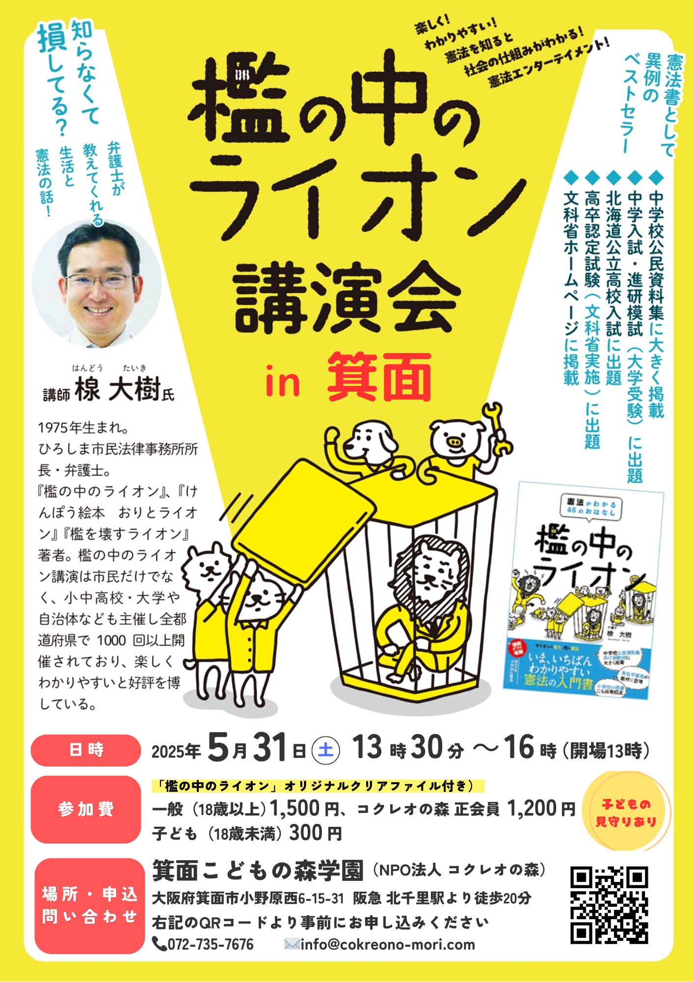 全国で1,000回以上の講演を行っている大人気講師・楾 大樹(はんどう たいき)さんをお迎えし、話題の憲法入門書『檻の中のライオン』をもとに、わかりやすく・楽しく憲法について学べるイベントを開催します。