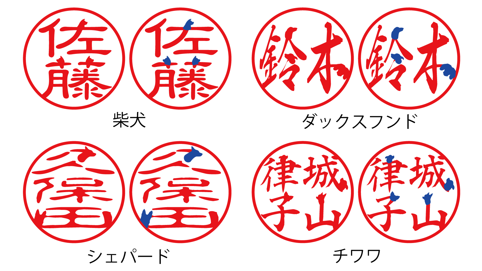 一般的な印鑑の形を元に、名前の一部(トメ・ハネ・角など)を犬の顔に変換。