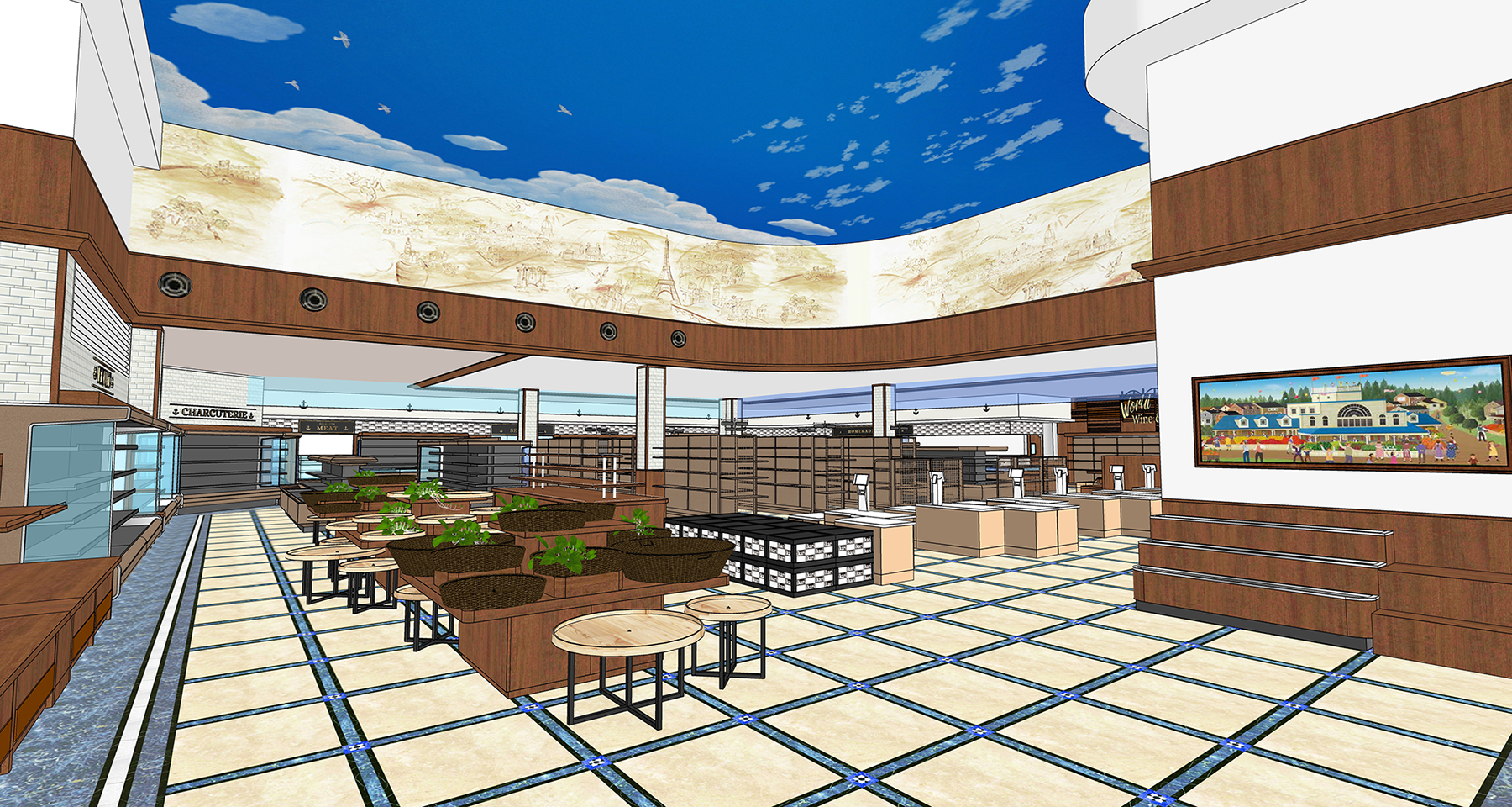開放感のあるガラス張りの外観に、いかりの代表的店舗「芦屋店」「夙川店」でも設置している、大型船舶で使用されていた本物の錨のモニュメントを、いかり豊中緑丘店にも設置。店内は、「青空」の天井に、関西在住イラストレーター「千秋育子(せんしゅうやすこ)」氏により描かれた壁画と、カラフルな色合いの床タイルで高級感溢れる欧州の街並みをイメージした明るい店舗に仕上がっています。