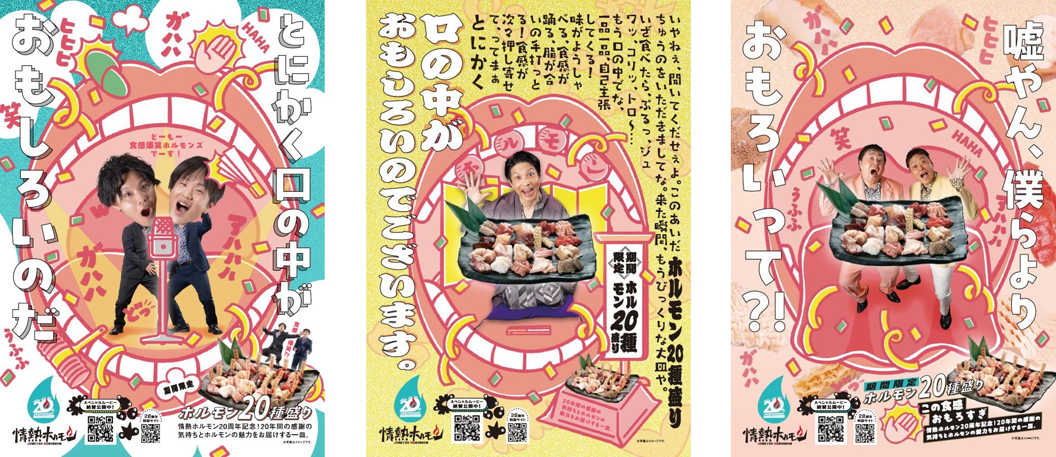 「20歳の夢見る若手お笑い芸人」「入門20年の節目を迎えた落語家」「苦節20年のベテラン芸人」の設定で、スタッフがモデルとなり口の中のおもしろさを表現。「ホルモン20種盛り」をアピールしています。