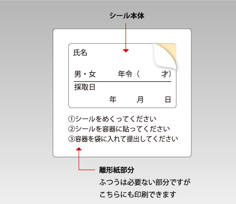 印刷ネットドットコム【検体管理用ラベル(離形紙部分に説明入り)】2025/6/20案内開始 検体を確実に管理するために 性別、年齢、採取日などを確認するためのシール。離形紙部分に説明を入れることができます。