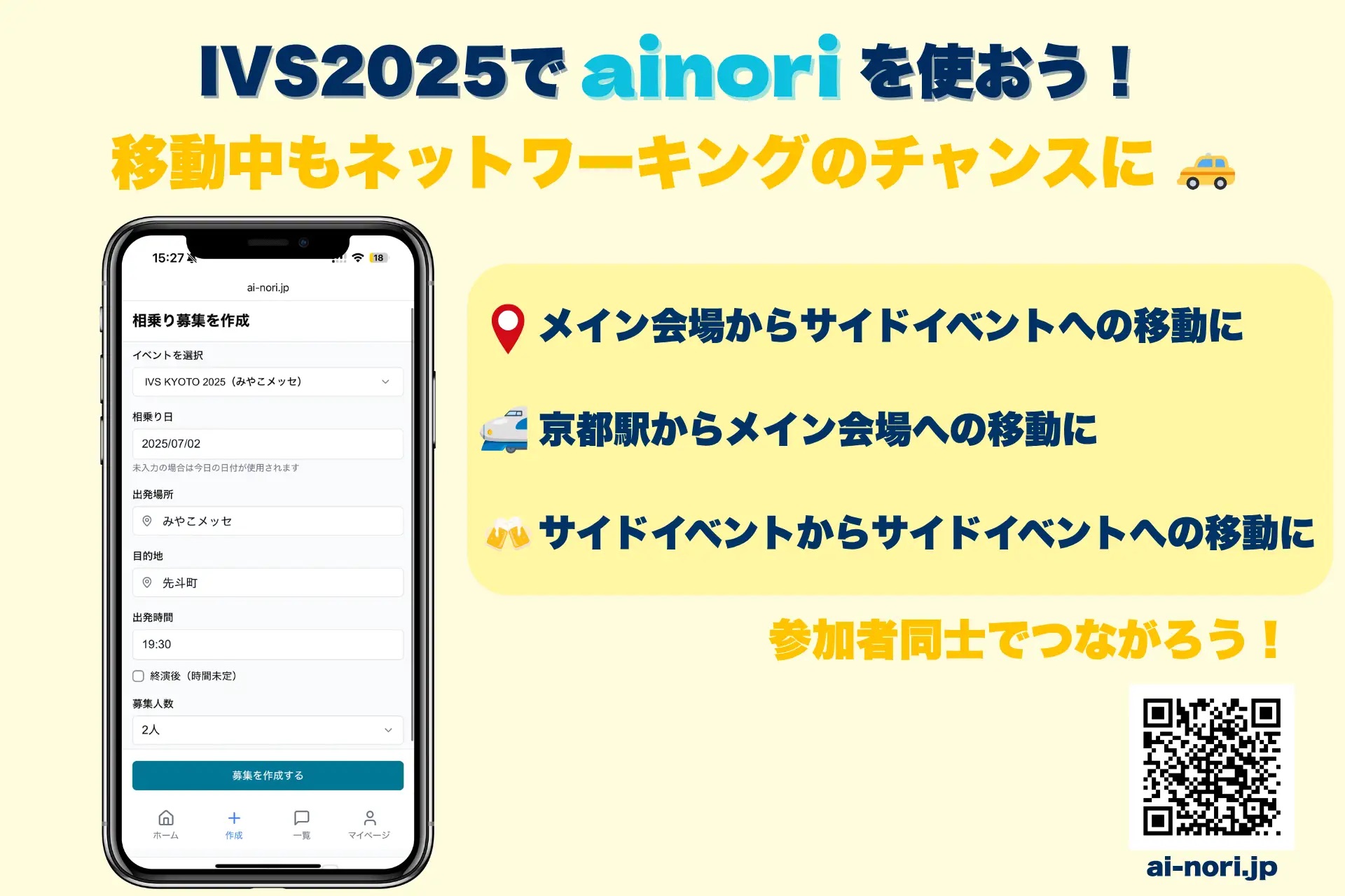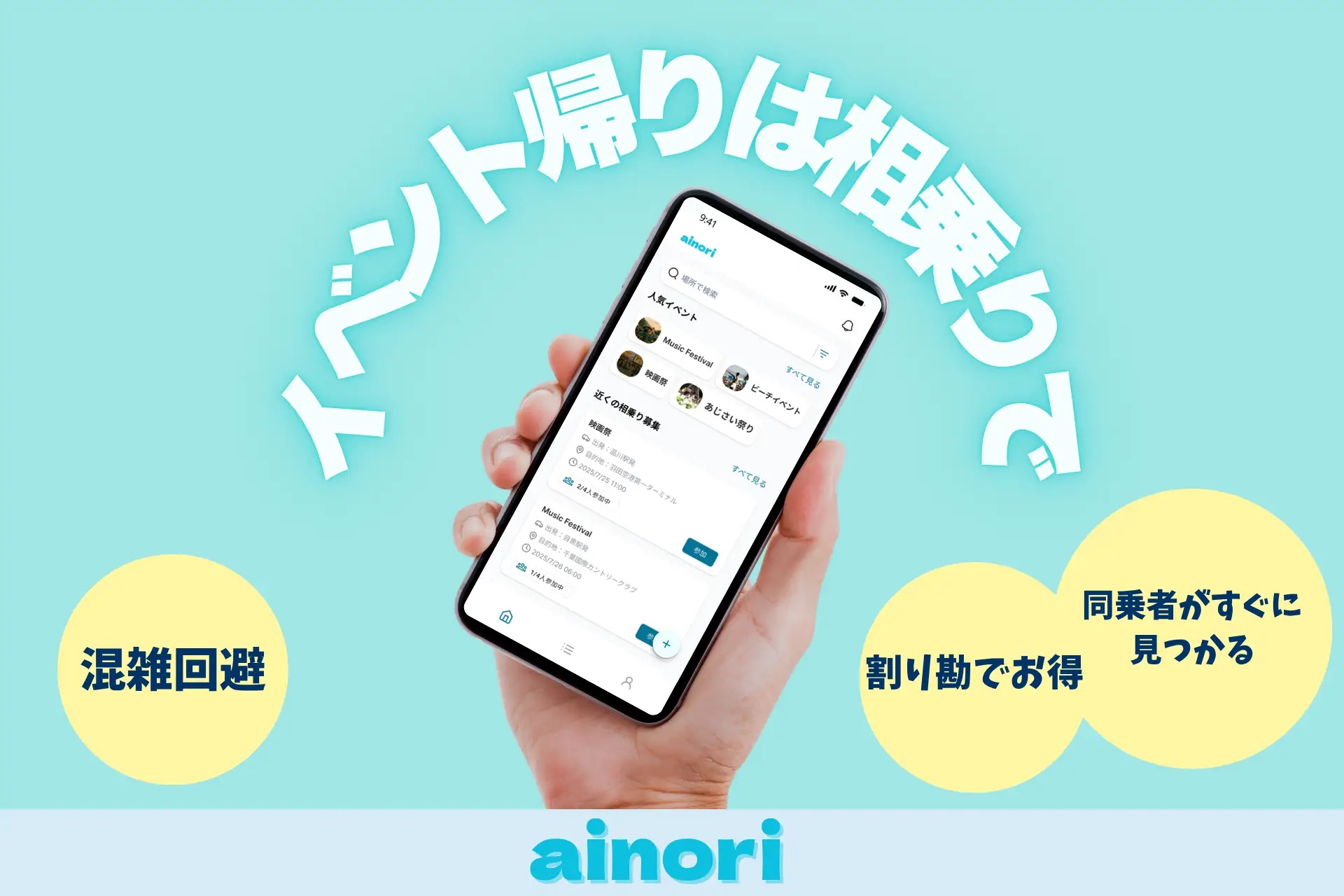 そこで私たちは、混雑しているエリアでスマートな移動を実現する手段として、タクシー相乗りマッチングサービス「ainori」を開始しました。同じイベントを楽しんだ仲間とタクシーをシェアすることで、金額も安心感も共有できる。そんな新しい移動の選択肢を全国のイベント参加者に届けていきます。