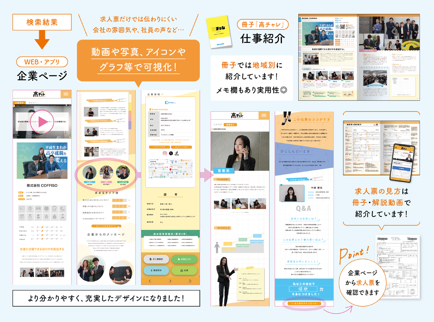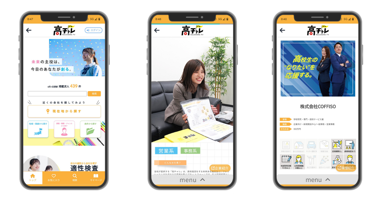 URL:https://koucharetv.jp/これまで白黒で文字のみだった求人票の情報を、高校生目線で重視した会社の雰囲気や実際に働いてる社員にインタビューなど写真や動画を用いて紹介することが可能です。高校生は7月の求人情報解禁後から求人票を直接見る事ができるので、そのまま進路指導の教員に相談し、職場見学から応募までスムーズにつなげることが可能です。