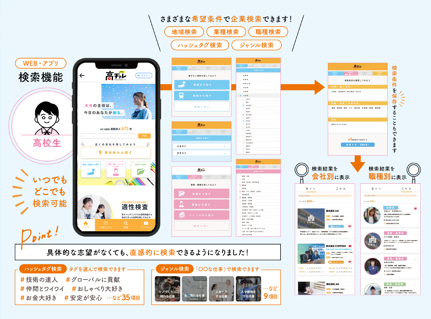 「地域検索」「業種検索」「職種検索」「ジャンル検索」「ハッシュタグ検索」など、進路が具体的に決まってる高校生には希望条件で、具体的に決まってない高校生には直感的に検索できるようになりました。