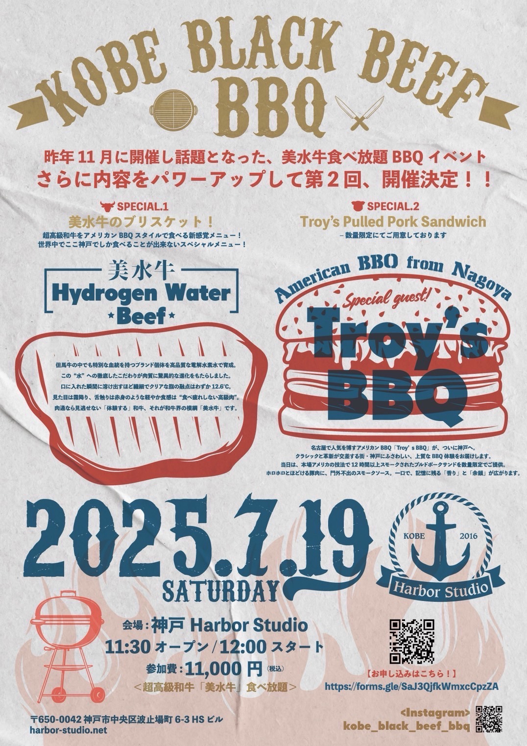 グルメとカルチャーの街・神戸にて、本場アメリカンBBQと神戸発のプレミアム和牛「美水牛(びすいぎゅう)」が共演するフードカルチャーイベント「KOBE BLACK BEEF BBQ」が、2025年7月19日(土)、**Harbor Studio(神戸市中央区)**にて開催されます。