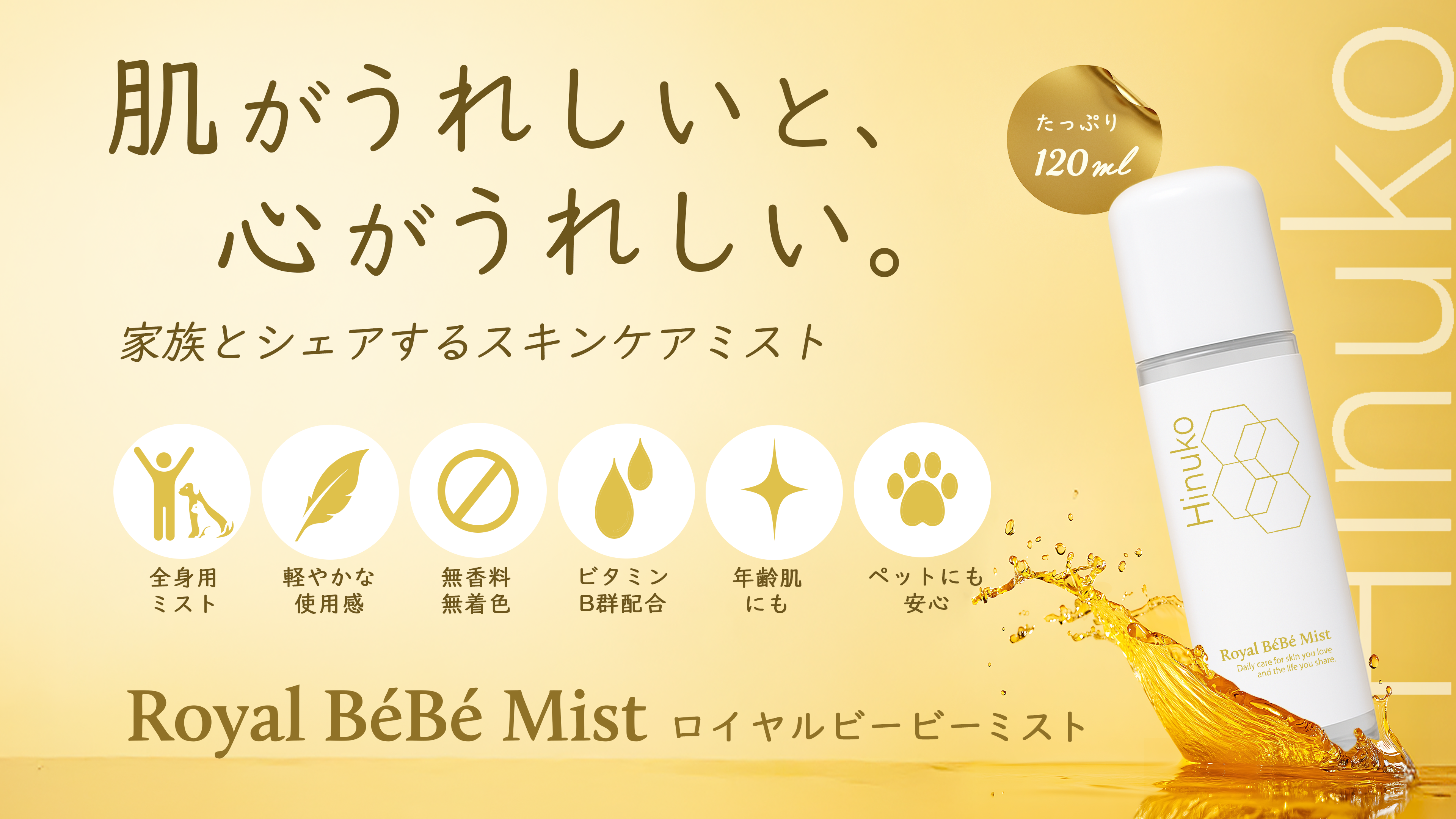 ペットと暮らす家族みんなが安心して使える新スキンケアブランド『Hinuko(ハイヌコ)』が誕生。第一弾アイテム『Hinuko Royal Bébé Mist(ハイヌコ ロイヤルベビーミスト)』は、ビタミンBを中心にしたやさしい成分設計と、ペットにも配慮した全身用ミストタイプ。業界プロや飼い主から注目を集めており、現在クラウドファンディング形式で先行販売中。