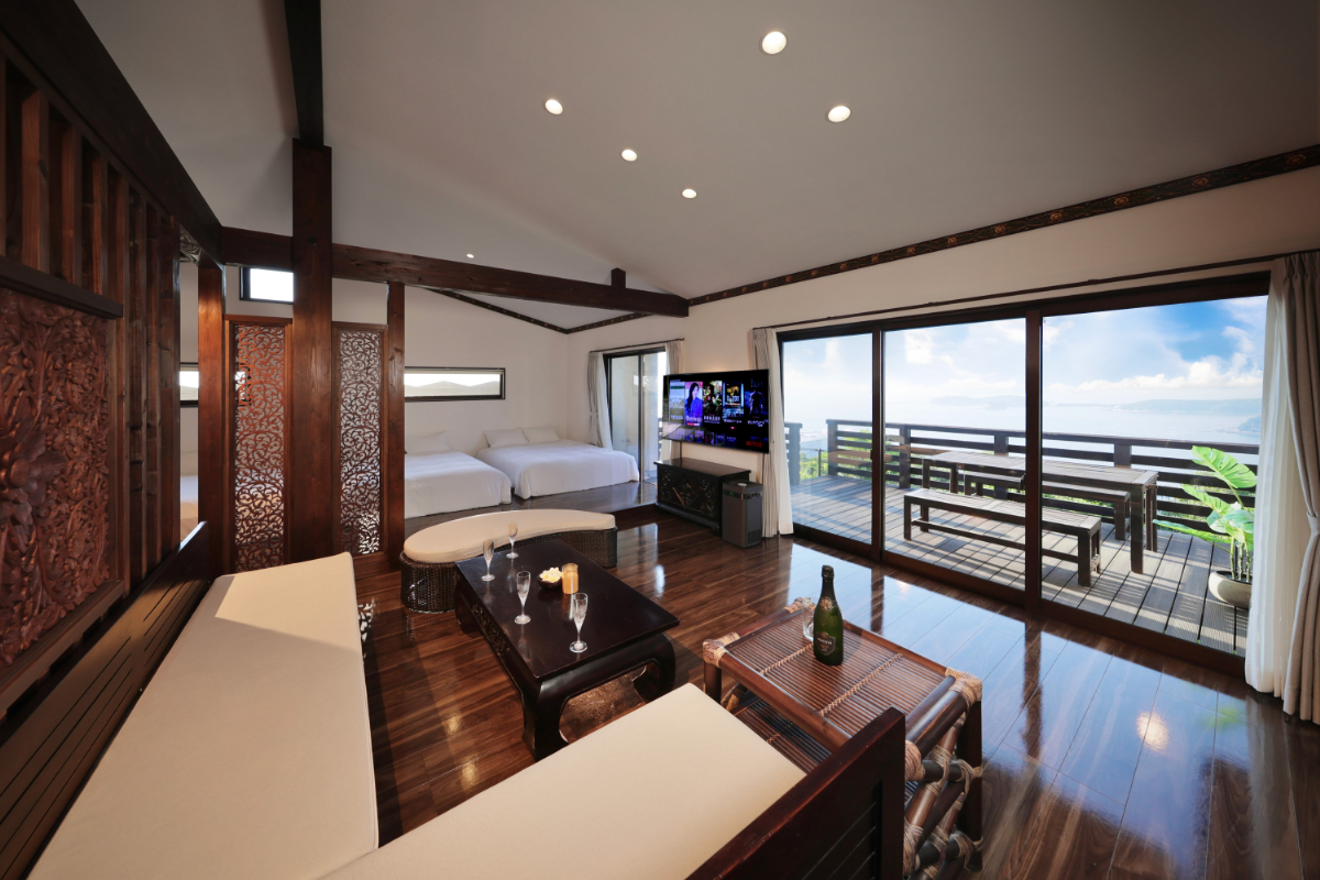 本施設は、白浜の海を一望できるオーシャンビューを備え、全棟で愛犬との同伴宿泊が可能です。当社として初めてバリ風のデザインを採用し、一歩足を踏み入れると、異国情緒あふれる空間が宿泊者をお出迎えします。外観は自然素材を活かしたリゾート感あふれる佇まいで、内装は南国のくつろぎを感じられるよう、家具や照明に至るまで細部にこだわり抜いて設計しました。