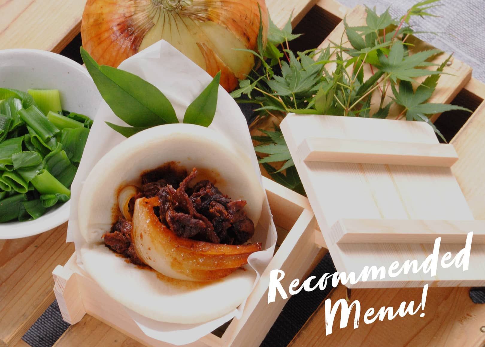 24時間かけてじっくり旨味を染み込ませた豚肉とお好きな旬サラダを、ふんわりとした半月型の蒸しパンに包んで食べます。