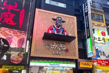 道頓堀商店街側の壁面には、十二単を身に着け正座する高さ6.7メートルの黒毛和牛の立体看板が、お客様をお出迎えいたします。新たな立体看板の登場で、道頓堀にさらなる賑わいを添えます。