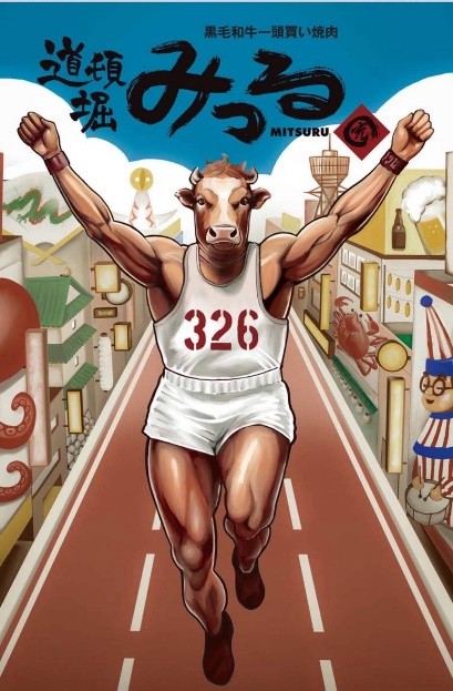 リニューアルの目玉は、道頓堀川に面するビル北側に設置した高さ11メートルの巨大看板。牛の顔をしたランナーが太陽の塔や通天閣、くいだおれ太郎などが並ぶ大阪の街を駆け抜けてゴールする様子が描かれています。道頓堀の新しい撮影スポットとして、国内外の観光客の方にお楽しみいただきたいと思います。