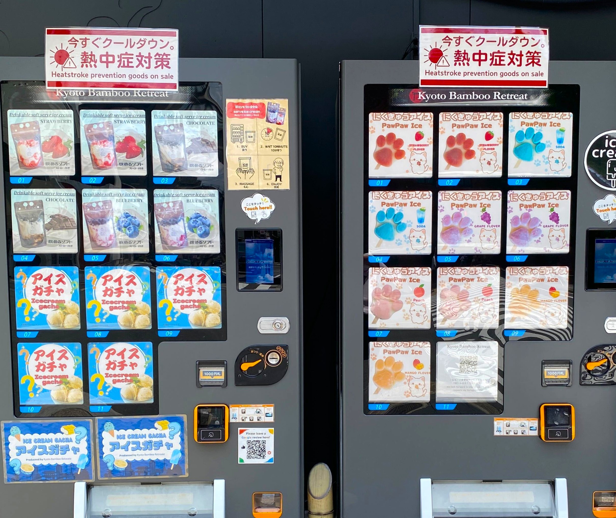 そんな中、京都市内の繁華街・烏丸に、12台の自販機が並ぶ「Kyoto Bamboo Retreat」では、4台が夏限定の“冷やしアイテム自販機”として稼働しております。アイスクリームやクールリング、熱中症対策ドリンクなどを取り揃え、観光客が手軽に涼と水分補給できるスポットとしてご利用いただいています。