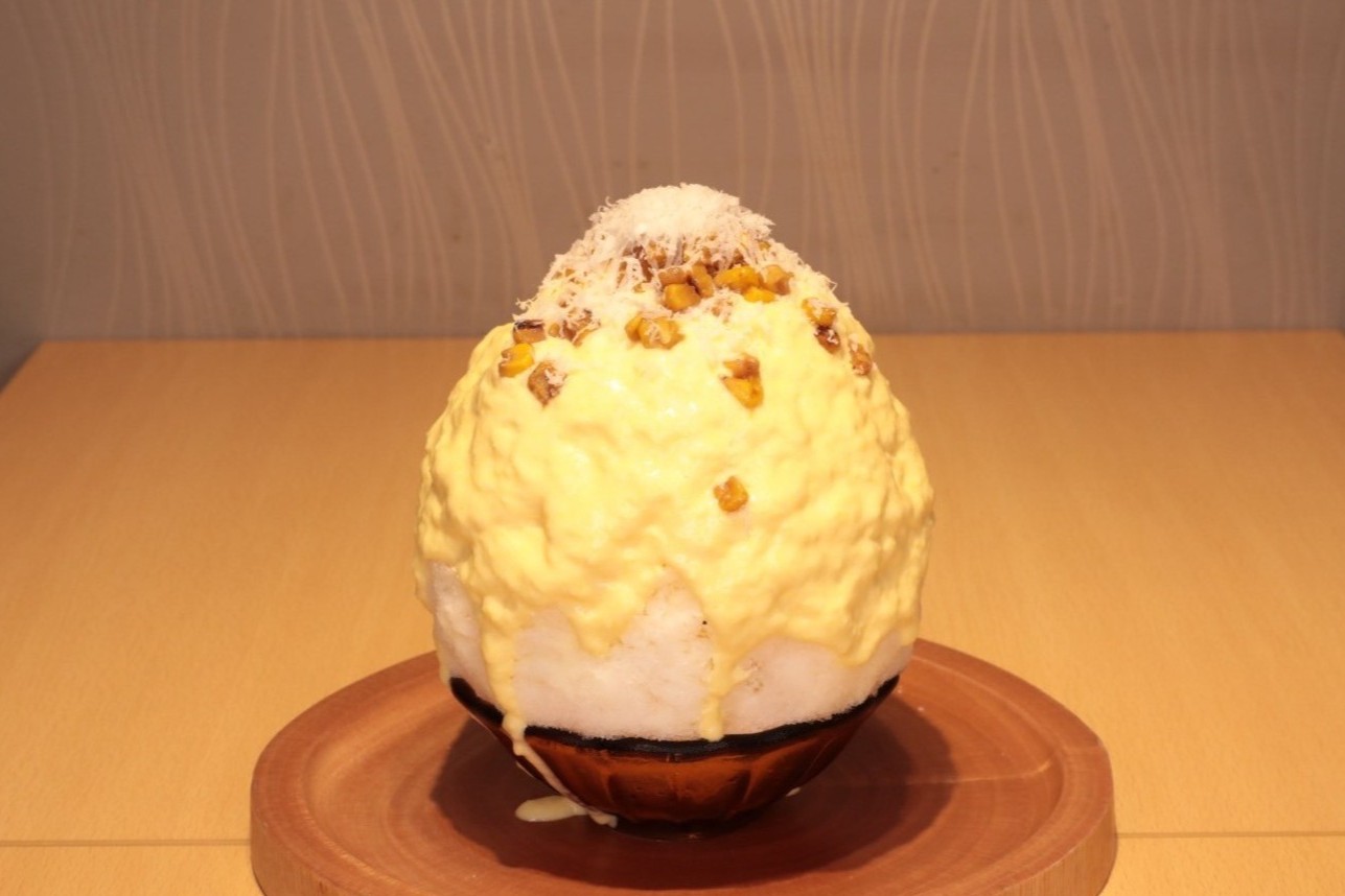 とうもろこしの冷製スープをイメージしたおかず系かき氷。ブラックペッパーやパルミジャーノをトッピング。