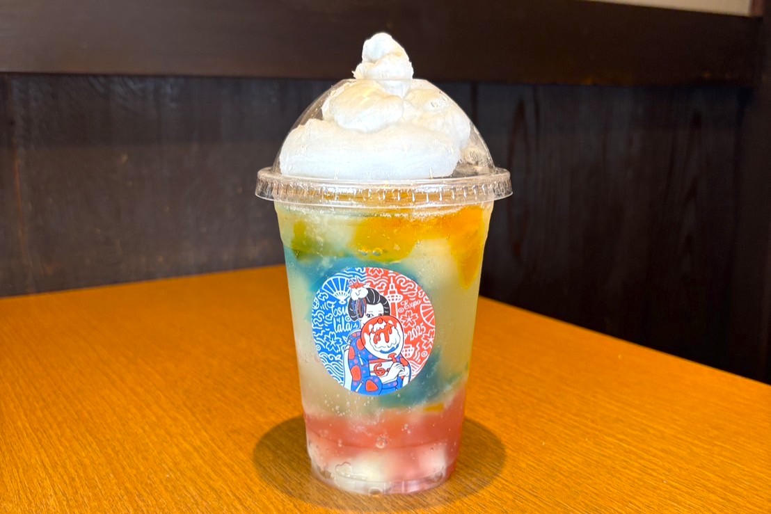このほか、かき氷はオープン当初から夏の人気No.1の人気メニュー「桃カスタード」や王道の「いちごミルク」、とうもろこしの冷製スープのような味わいの「焼きもろこしポタージュ」、新しいみたらし団子をイメージした「あたらし団子」をラインナップ。万博限定のドリンク「灼熱のシャクシャク桃ソーダ」もご用意しています。