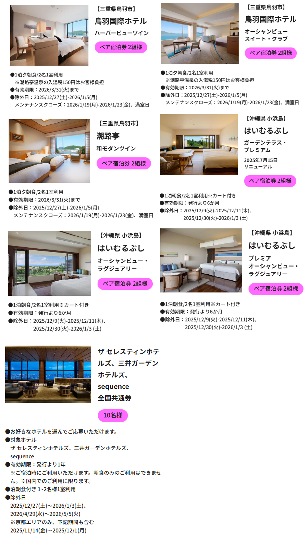 ザ セレスティンホテルズ、三井ガーデンホテルズ、sequence 全国共通券 10名様