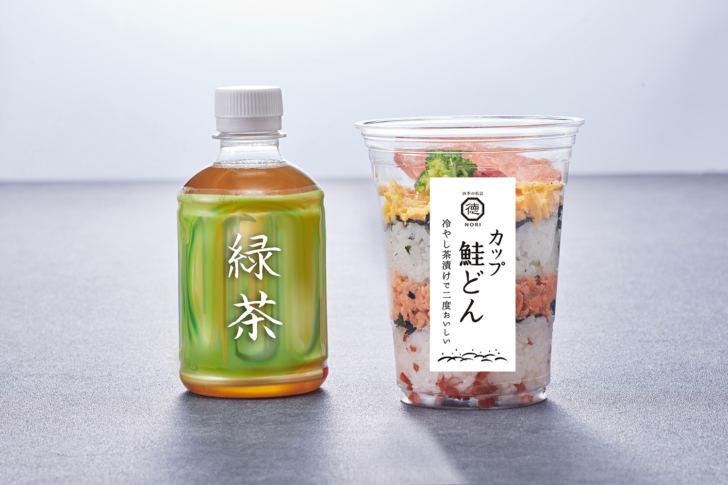 カップの器に2種類の焼き鮭(西京焼と幽庵焼)をはじめ、玉子焼、海苔、御飯をミールフィーユに重ねた新スタイルのお茶漬けとなっています。まずは“鮭ごはん”として食べて頂き、途中から緑茶を入れてお茶漬けにしてお召し上がりいただきます。