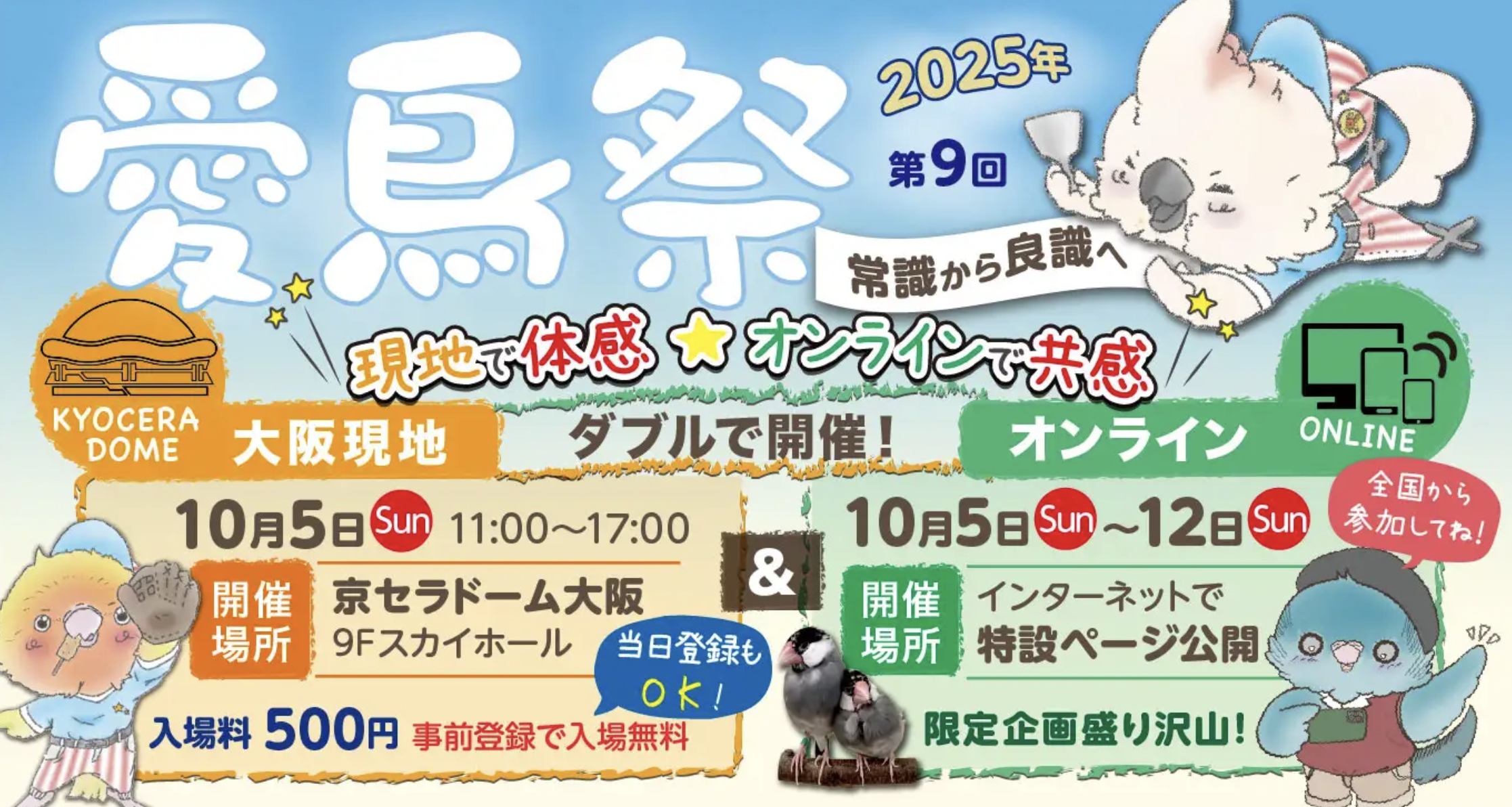 認定NPO法人TSUBASA(所在地:埼玉県、代表:松本壯志)は、2025年10月5日(日)、大阪・京セラドーム(スカイホール)にて「第9回 愛鳥祭」を開催いたします。関西エリアでは初開催となる本イベントは、鳥好きの方からご家族連れまで幅広く楽しめるだけでなく、鳥と人とのより良い共生を考える「学び」と「社会貢献」の機会を提供します。