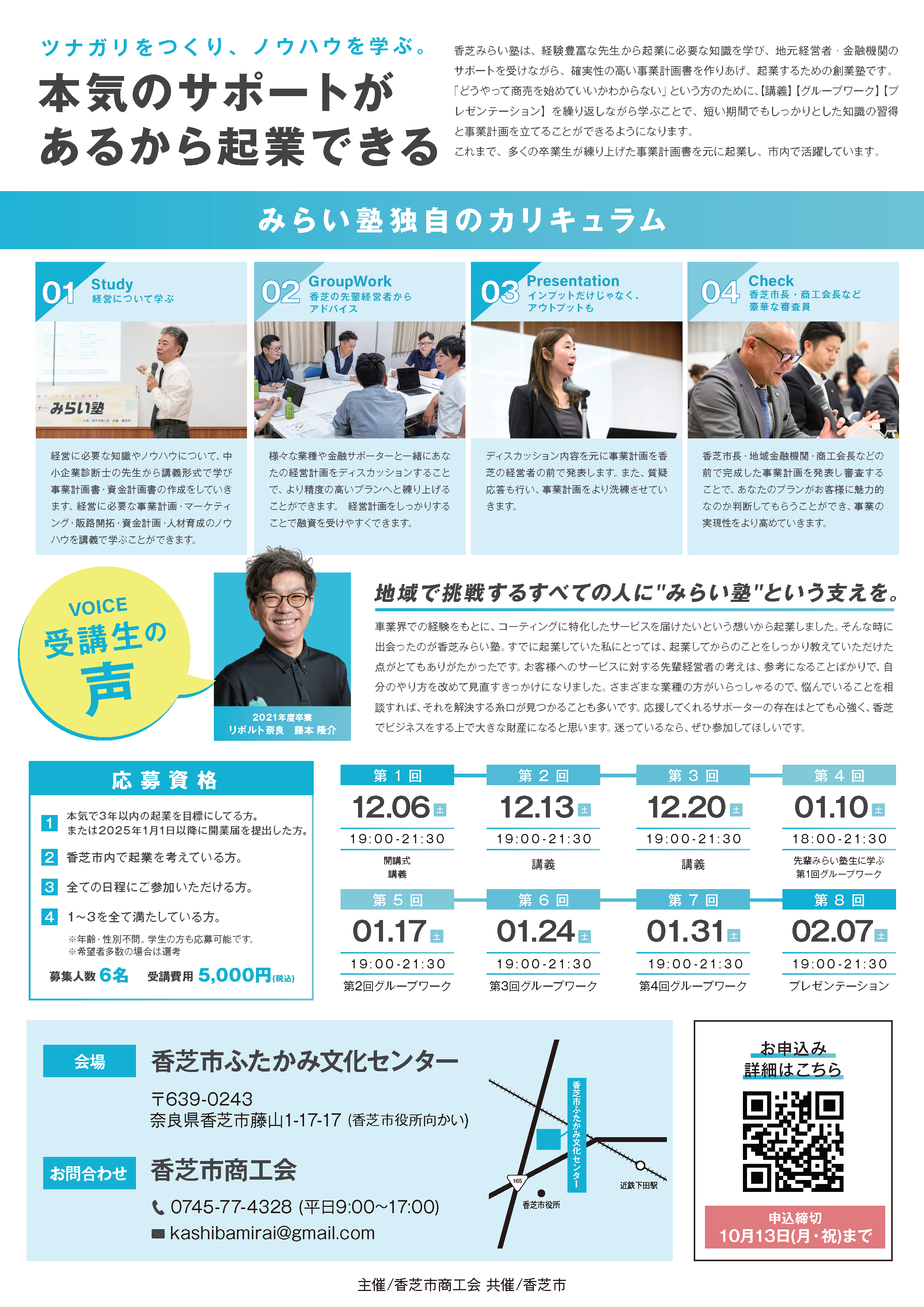 香芝市商工会は、香芝市内での創業をめざす方を対象に、講義×実践×討論で事業計画を磨き上げる創業塾「香芝みらい塾 2025」の受講生を募集します。