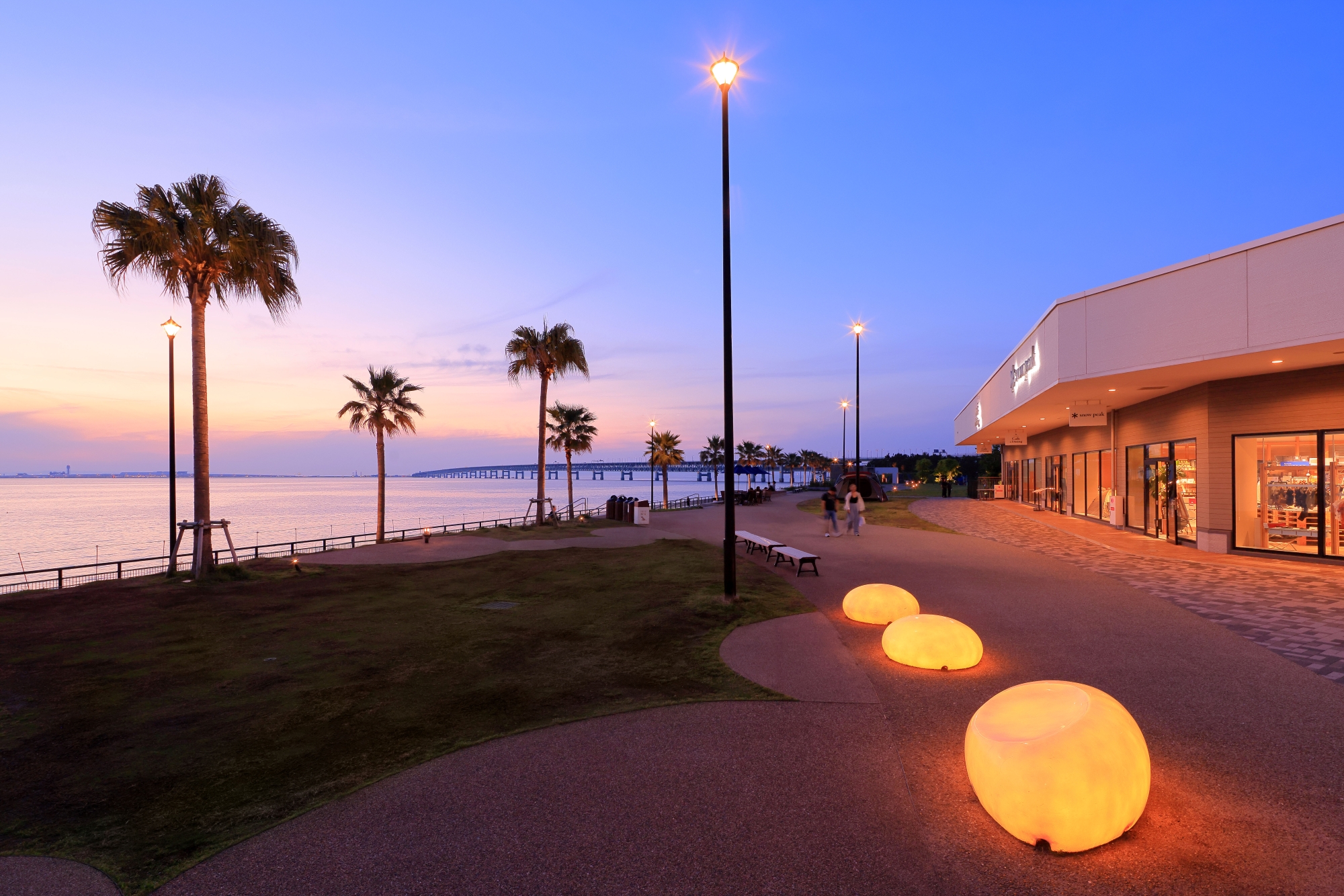 2000年11月に開業し、今年で開業25周年。2020年に増設したシーサイドエリアには、海に沈む夕日を堪能できる芝生広場やグランピング施設があり、関西空港を対岸に、風に揺れるヤシの木と広い海を見渡せる唯一無二のシーサイドアウトレットへと成長しました。