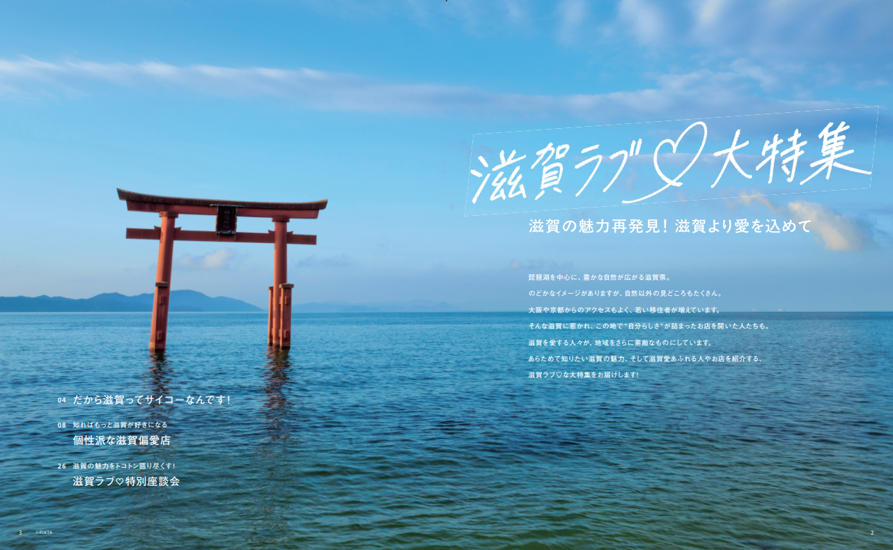 巻頭特集「滋賀ラブ♡大特集」では、琵琶湖を中心に自然・歴史・文化に根ざした滋賀の魅力を紹介。観光視点ではなく、地元で商いを営む人々の声や個性あるお店を通して“地域のリアル”を伝え、滋賀の新たな魅力を知ってもらえる内容です。さらに、地域を支える人々の姿を描くことで、読者に「滋賀を訪れたい、応援したい」という共感を呼び起こし、地方創生の一助となることを目指しています。