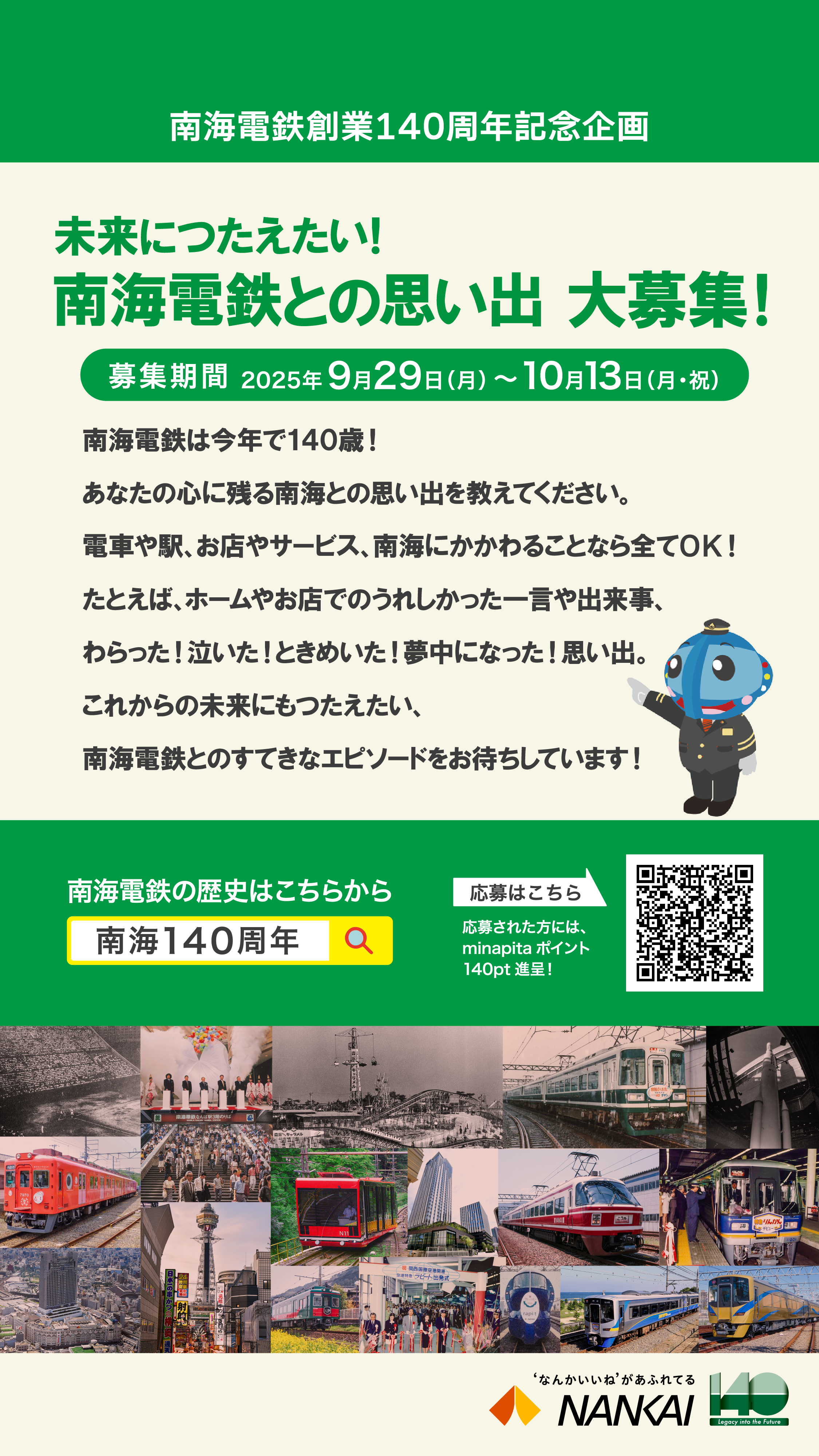南海電気鉄道株式会社(社長:岡嶋 信行、以下「南海電鉄」)は、創業140周年記念企画「未来につたえたい!南海電鉄との思い出」のエピソード募集を9月29日(月)から開始します。これから先も皆さまと未来を描いていくために、南海電鉄との思い出をぜひお聞かせください。