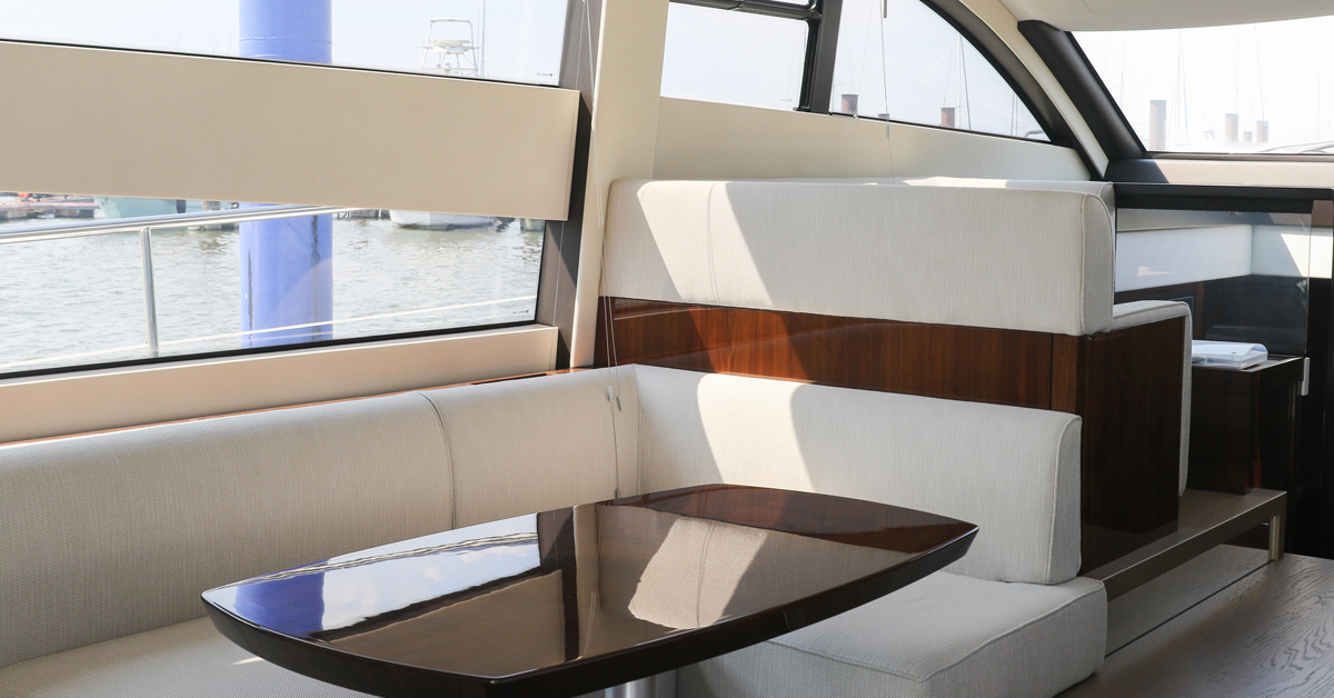 ラグジュアリークルーザー「スコードロン50」。 全長15mを超える船体は広々としたサロンとフライブリッジを備え、まるで海上のラウンジのような快適さを実現しています。 落ち着いたインテリアに包まれながら、ゆったりと花火を鑑賞できる贅沢なひとときを。