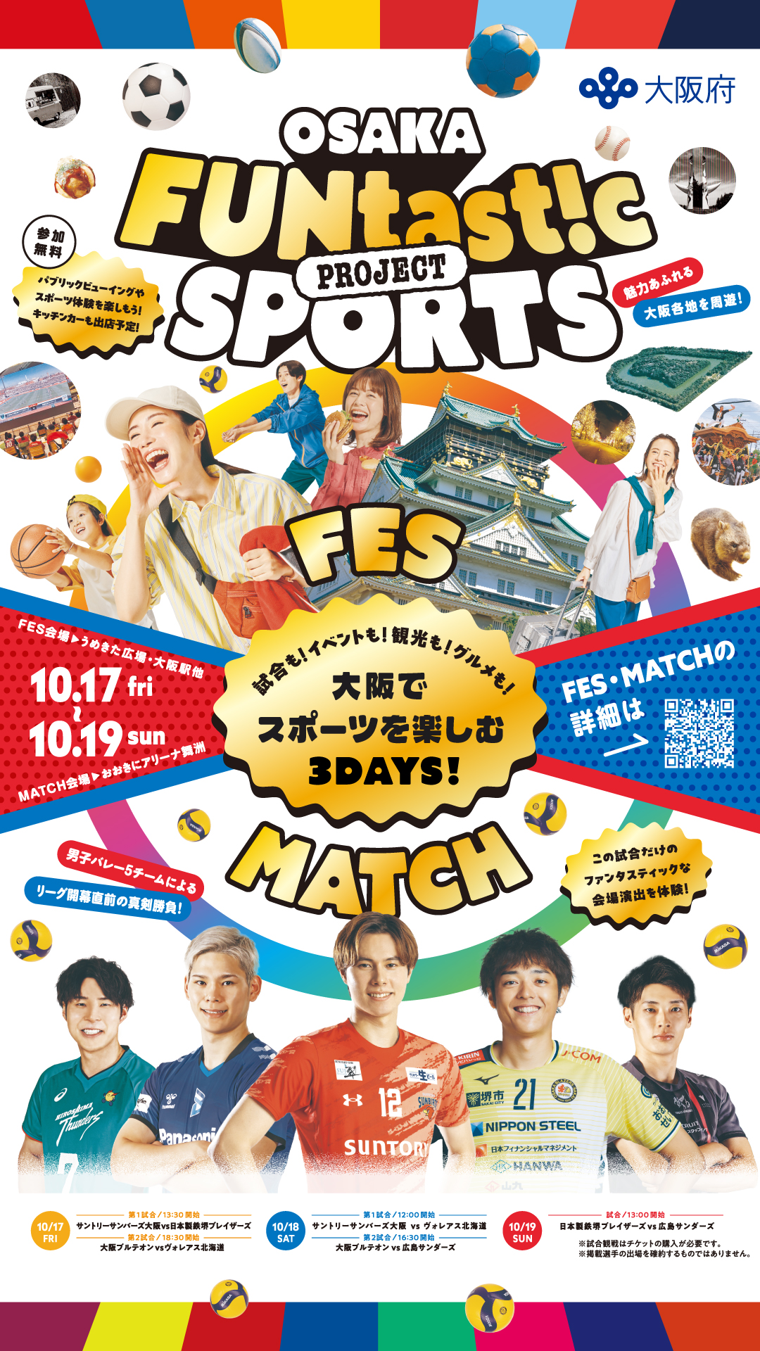 本プロジェクトでは、府内各所においてスポーツ体験やアスリートによるステージなどを展開し、多彩なプログラムを通じて誰もが気軽にスポーツの魅力に触れることができる「OSAKA FUNtast!c SPORTS FES」と、おおきにアリーナ舞洲において大同生命SV.LEAGUE所属の在阪3チームを含む5チームによるバレーボールのスペシャルマッチを実施し、迫力ある試合観戦を楽しめる「OSAKA FUNtast!c SPORTS MATCH」を同時開催いたします。