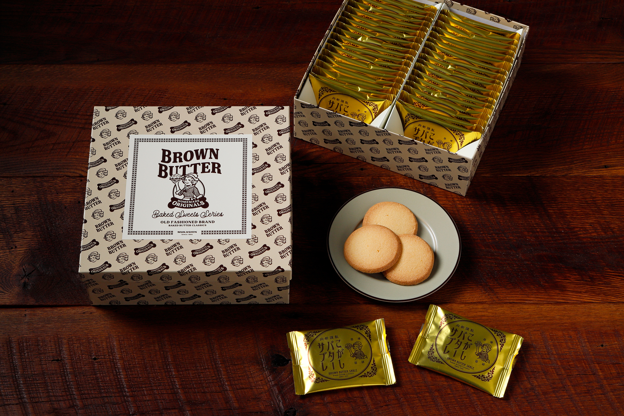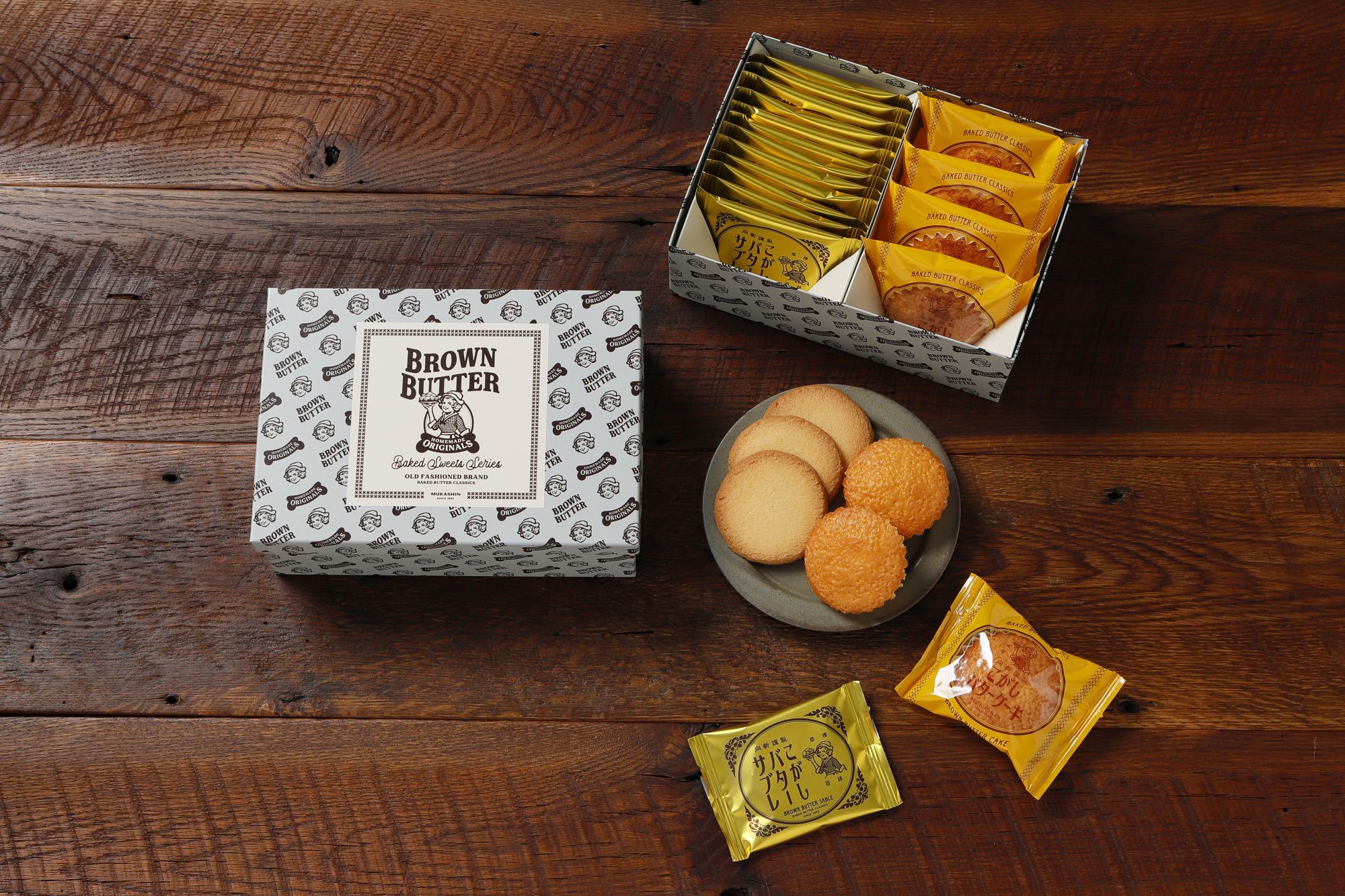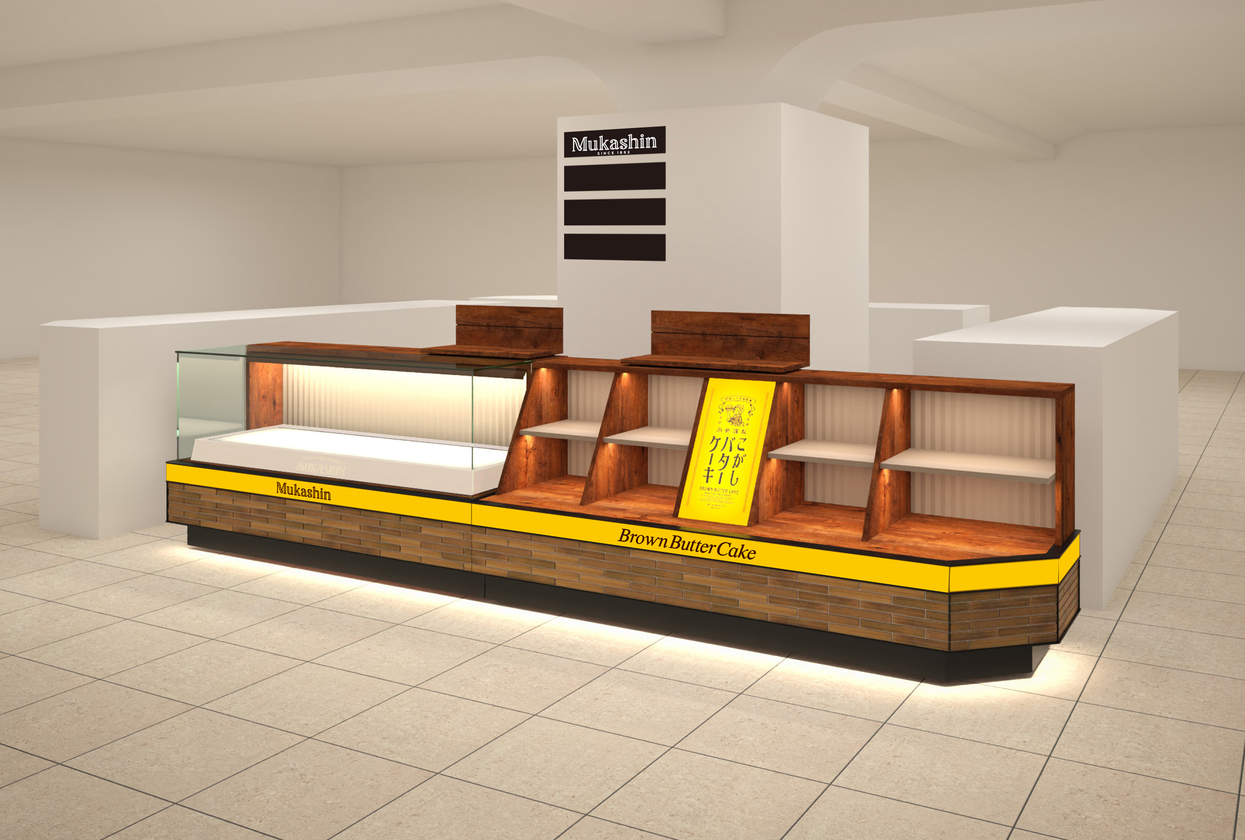 「こがしバターケーキ」初のブランドショップとしてオープンする 「Mukashin」は、「こがしバターケーキ」を中心に「こがしバターサブレ」や限定商品などをギフトから日常の手土産やおやつとしてもお求めいただけるよう様々な形態でラインナップしています。
