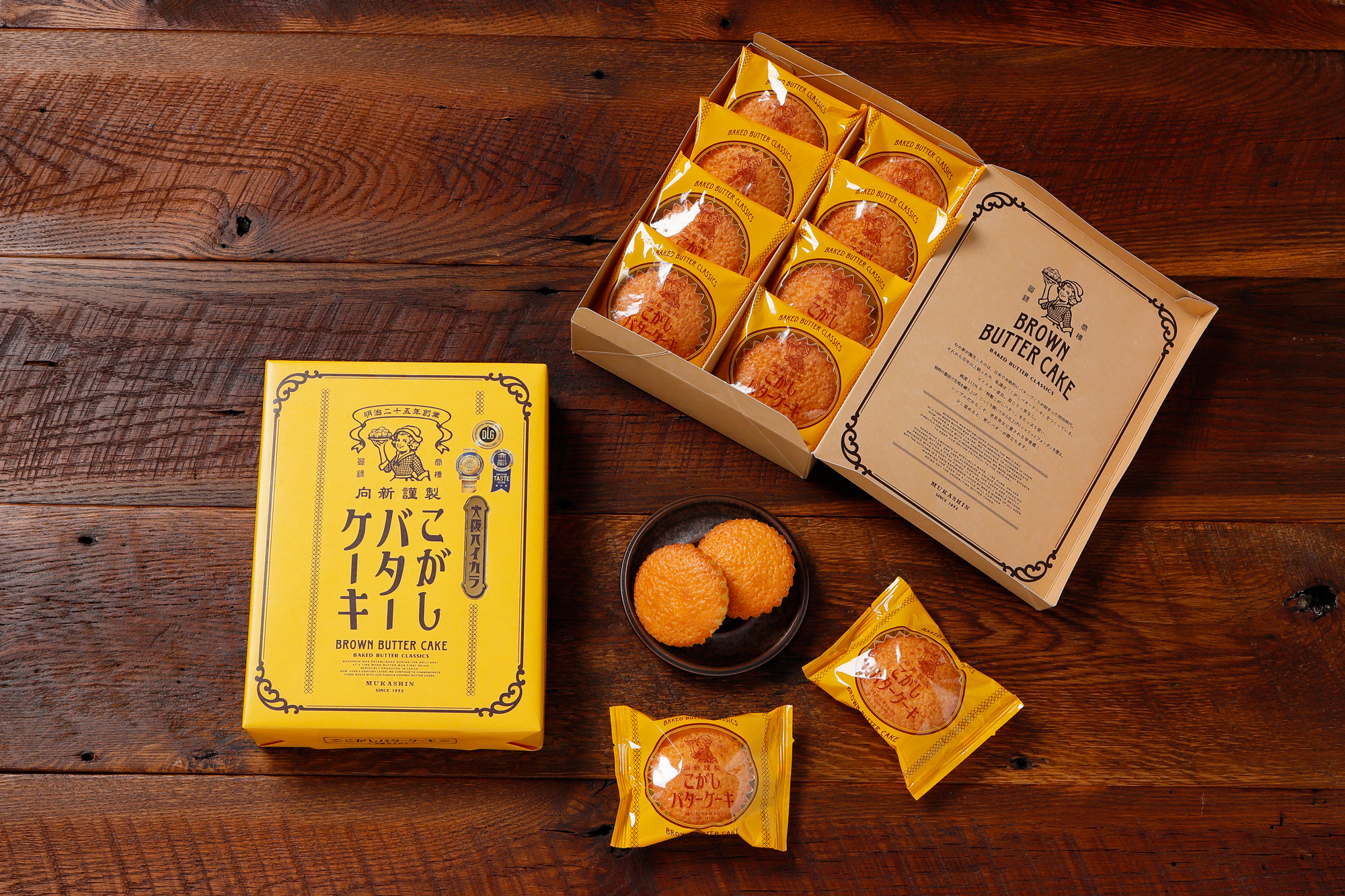 「和菓子屋として明治25年に創業したむか新がその当時、もし洋菓子店を開いていたら・・・」という想いで2020年のコロナ禍に大幅にリニューアルを行った「こがしバターケーキ」。遡ること2002年、発売を前にしたベテラン和菓子職人の工場長が、もっとバターの風味を出したいと悩んでいたところ、過去に同じ職場で出会ったオーストリア人マイスターと運命の再会。それをきっかけに「こがしバター」の製法を直接教わることになりました。マイスター直伝の製法でつくる黄金に輝く「自家製こがしバター(BROWN BUTTER)」を生地に使うことでさらにバターの風味が凝縮された逸品に完成しました。たっぷりのこがしバターを贅沢に練り込んだ生地には、和菓子職人ならではのカステラに使われるような材料や生クリームなどのミルク感が複雑に交わります。