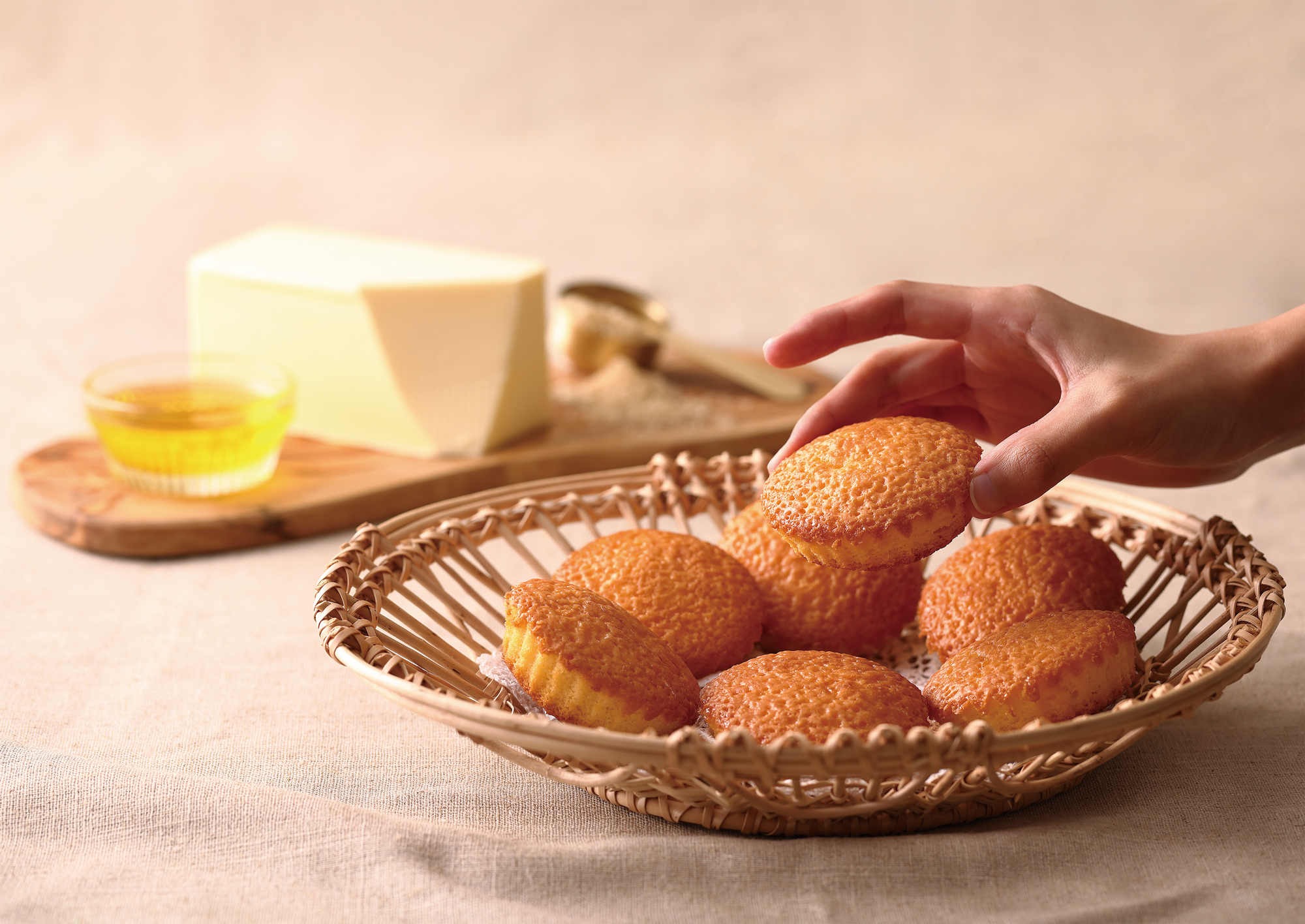 また、隠し味には、種子島産ブラウンシュガーと生絞りレモンを入れることで濃厚なバターのコクをさらに引き立てています。一般的な洋菓子の生地の混ぜ方とは異なり、和菓子職人ならではの独特な「生地を練り合わせる」製法で出来た生地は、表面はサックリ、中はふんわりとした独特の食感に焼き上がります。最後にシャリシャリとした食感のフォンダンを手作業でひとつひとつ塗って仕上げています。電子レンジやトースターで少し温めると、バター の香りが引き立ち、出来立てのような味わいをお楽しみいただけます。