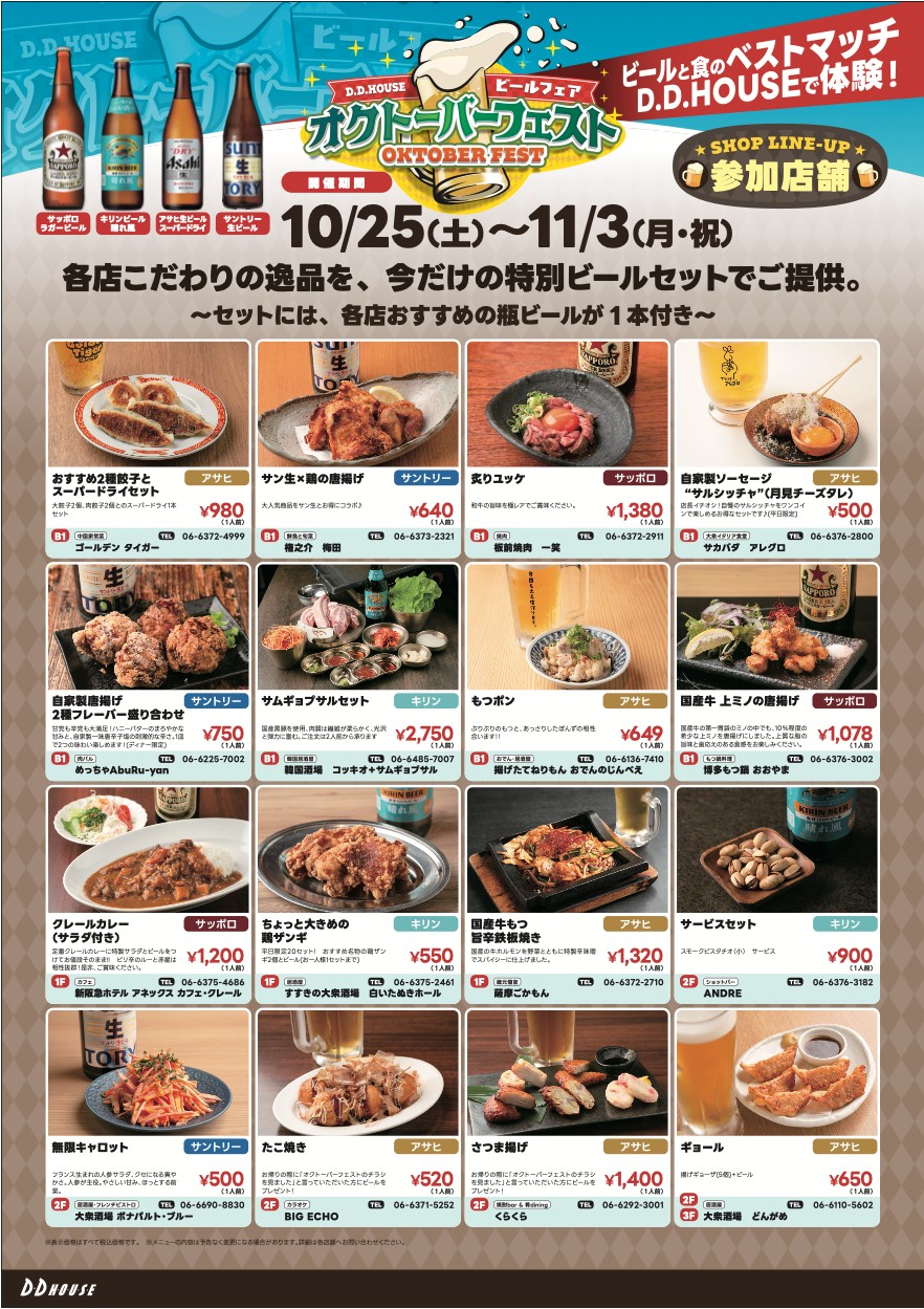 D.D.HOUSE オクトーバーフェスト実行委員会は、2025年10月25日(土)から11月3日(月・祝)の期間限定で、阪急大阪梅田駅近くの複合施設「D.D.HOUSE」(大阪市北区芝田一丁目8番1号)にて、ビールとイチ押しフードが楽しめるイベント「 D.D.HOUSE オクトーバーフェスト」を開催します。