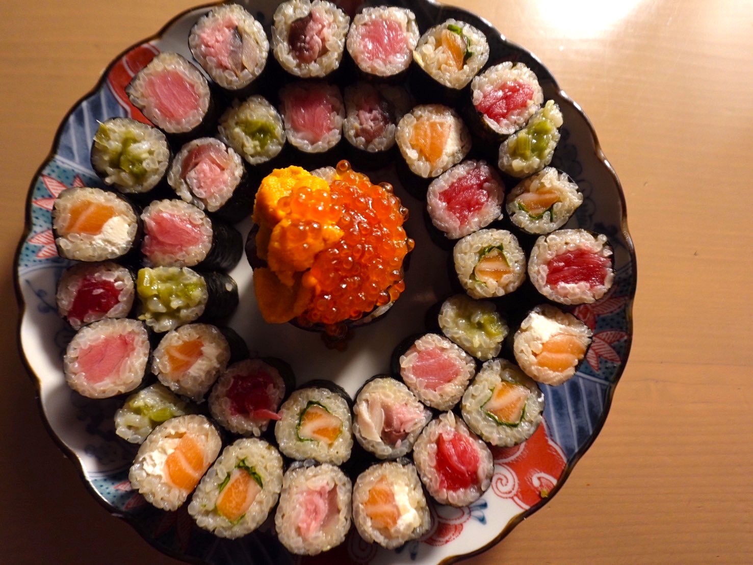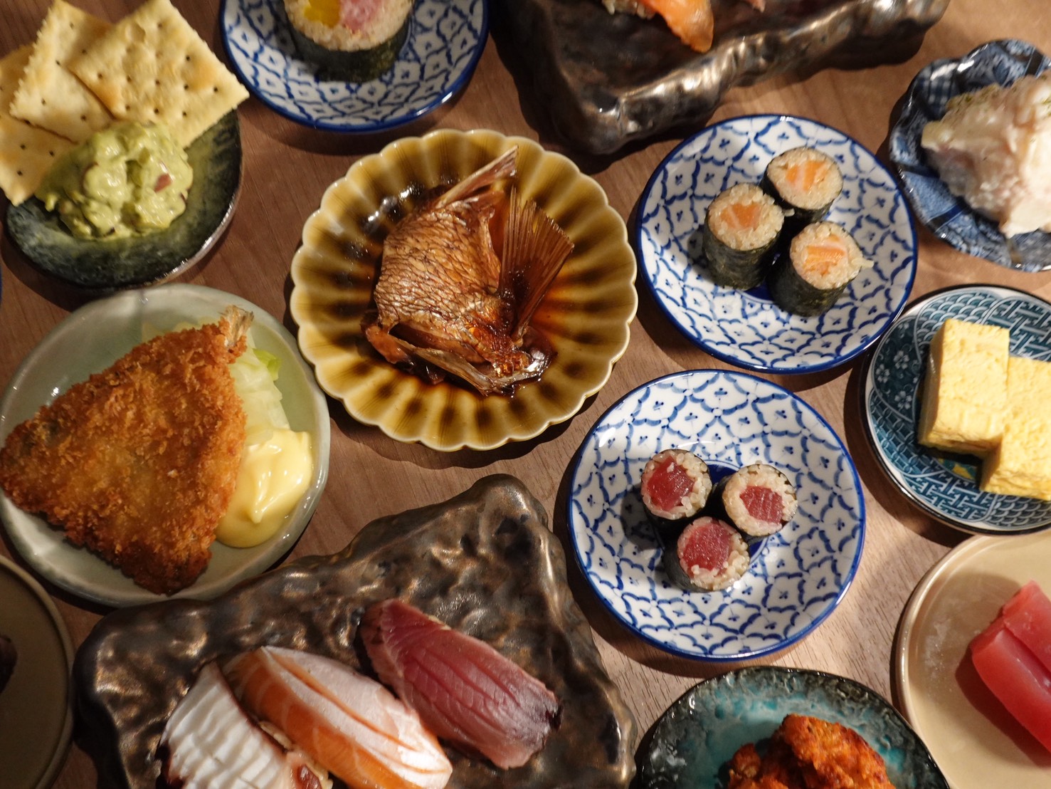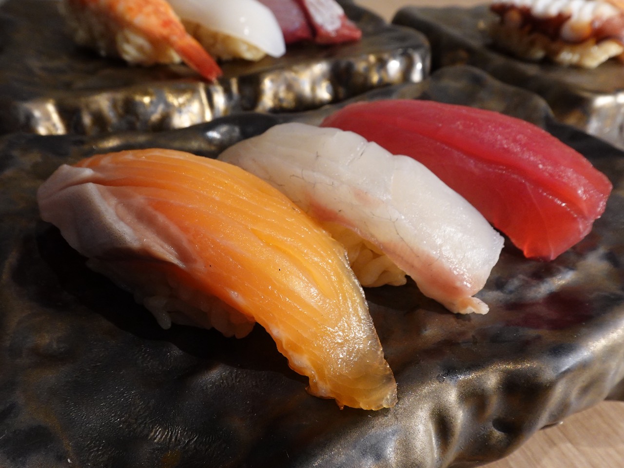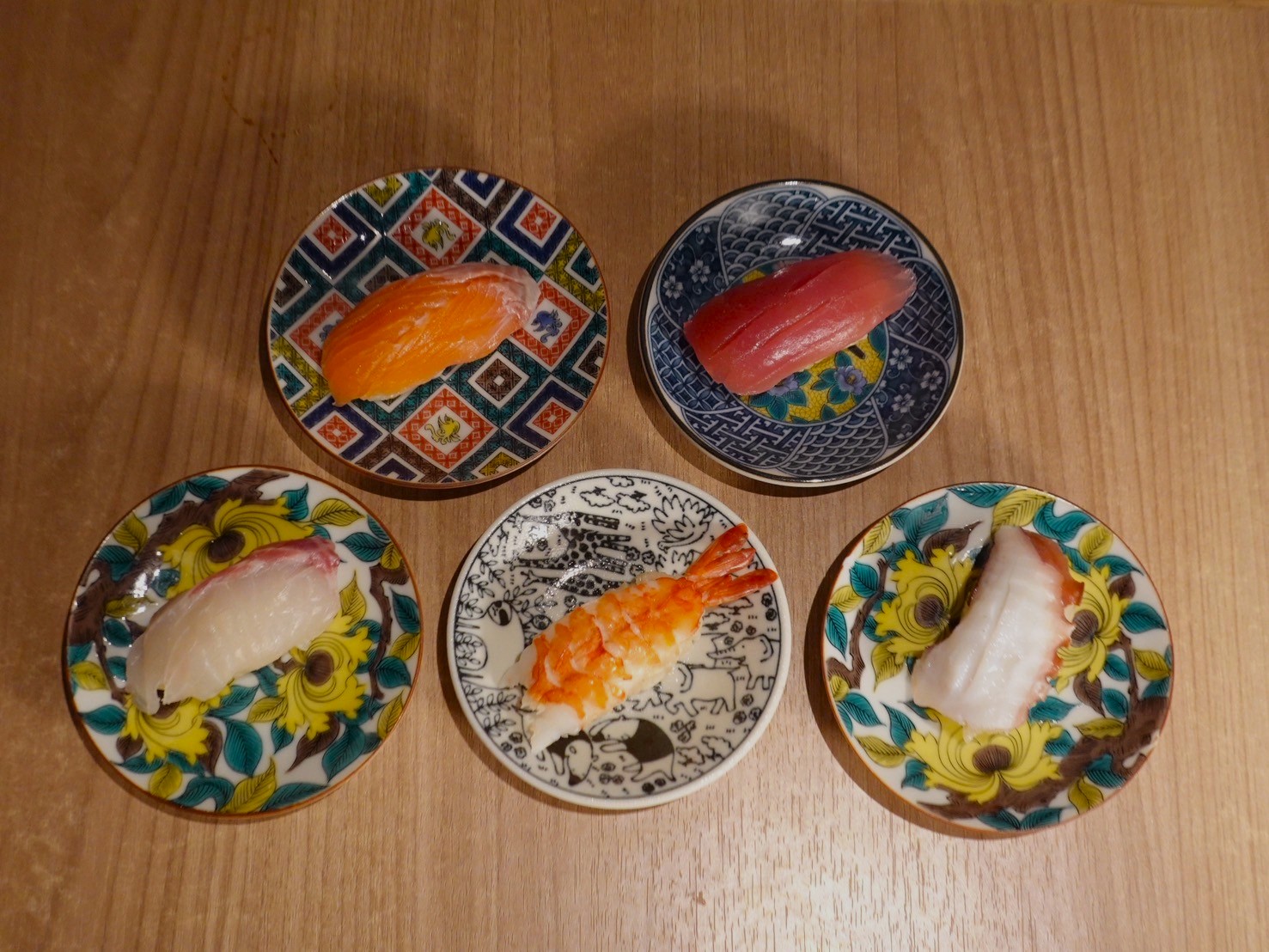 写真左上から時計回りにサーモン、マグロ、タコ、エビ、真鯛