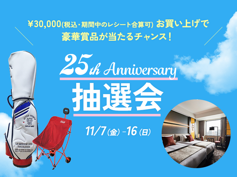 人気ブランドによるここでしか買えない25周年限定アイテムの販売や、25にちなんだお得な価格の商品、数量限定の記念セットなども販売します。また、秋冬で大活躍するニットやアウターなど今すぐ使えるファッションアイテム、アウトドア・スポーツグッズなど、各ブランドでお値打ち価格の商品が揃います。