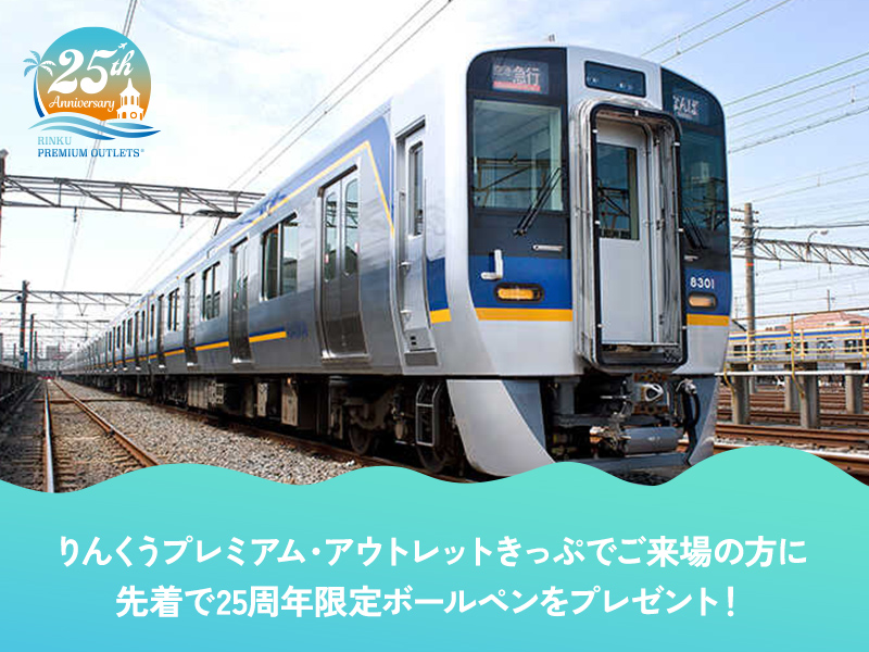 南海電鉄を利用してお得にショッピングを楽しんでいただける「りんくうプレミアム・アウトレット25周年記念ノベルティ付き特別きっぷ」を発売します。発売駅〜アウトレット最寄りである「りんくうタウン」駅の割引往復乗車券と、りんくうプレミアム・アウトレットお買い物券引換券1,000円分、さらに、記念ノベルティ(25周年ロゴチャーム付きボールペン)がセットになったお得な切符です。この機会に、ぜひ南海電鉄でりんくうプレミアム・アウトレットまでご来場ください。