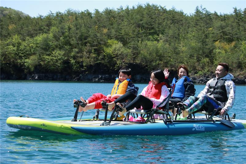 「HOBIE」は水に濡れにくく、転覆しにくい構造のため、体力や年齢に関係なく“誰でも”楽しめ、走行中はハンズフリーという”足漕ぎ“ならではの特性を活かした新しい体験を味わうことができます。立ち漕ぎの1人乗りのほか、着座スタイルの4人乗りも準備しておりますので、複数人でも会話を楽しみながらご参加いただけます。