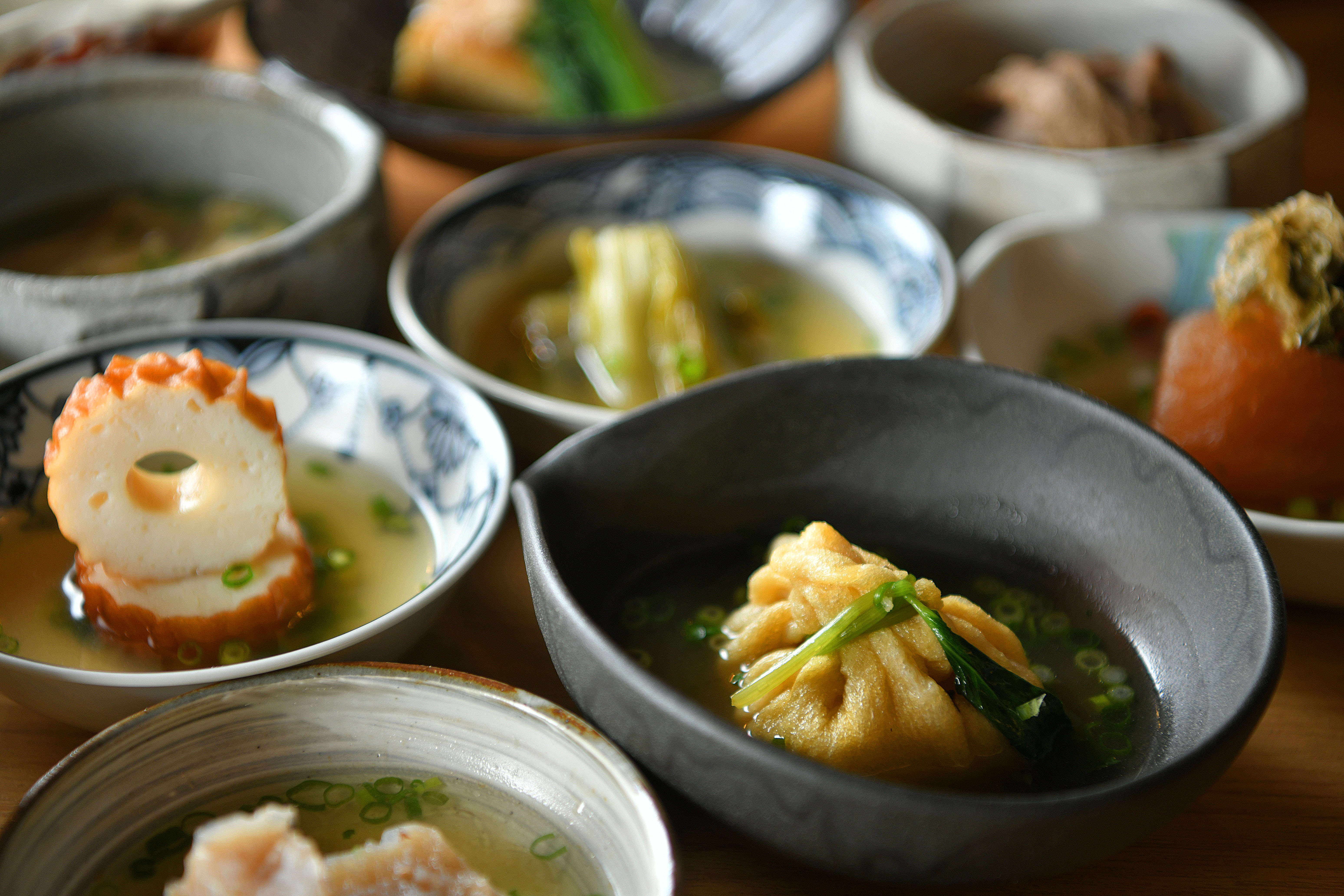 丁寧にひいた透き通るかつお出汁で仕上げた至高のおでんは、具材ひとつひとつの旨味を引き立てるだけでなく、出汁そのものも楽しんでいただきたい一品です。全国各地から取り寄せた厳選素材を用い、仕込みにも料理長ならではの工夫を凝らしました。