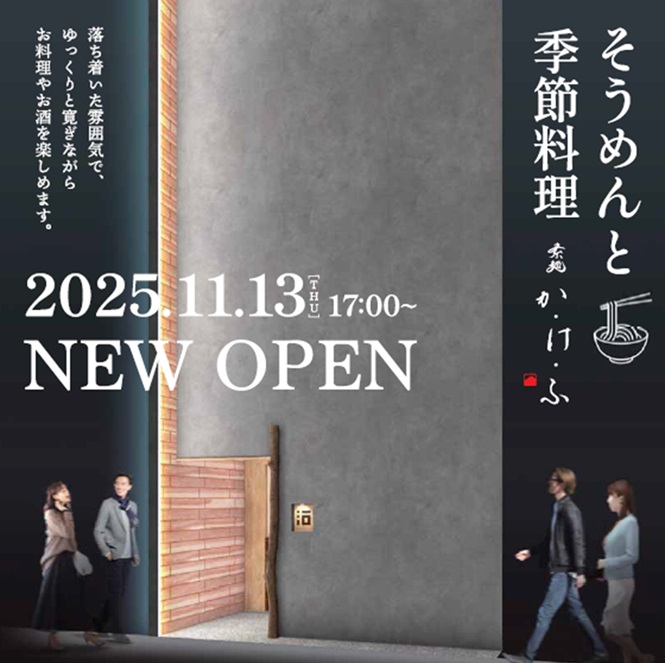 株式会社HASSIN(本社:大阪府大阪市浪速区、代表取締役社長:東 直人)は、2025年11月13日(木)17時、大阪・北新地エリアに、職人の手仕事が光る和・洋・中の多彩な料理や、食事の締めくくりを軽やかに楽しむ〆素麺など約100品以上取り揃え、料亭のような上品さと居酒屋の親しみやすさを兼ね備えた“大人の居酒屋”「北新地 素麺 か・け・ふ」(住所:大阪市北区曽根崎新地1-3-32)をオープンいたします。産地にこだわった食材や器の美しさなど、心を満たす一皿を五感で味わう上質なひとときを提供いたします。