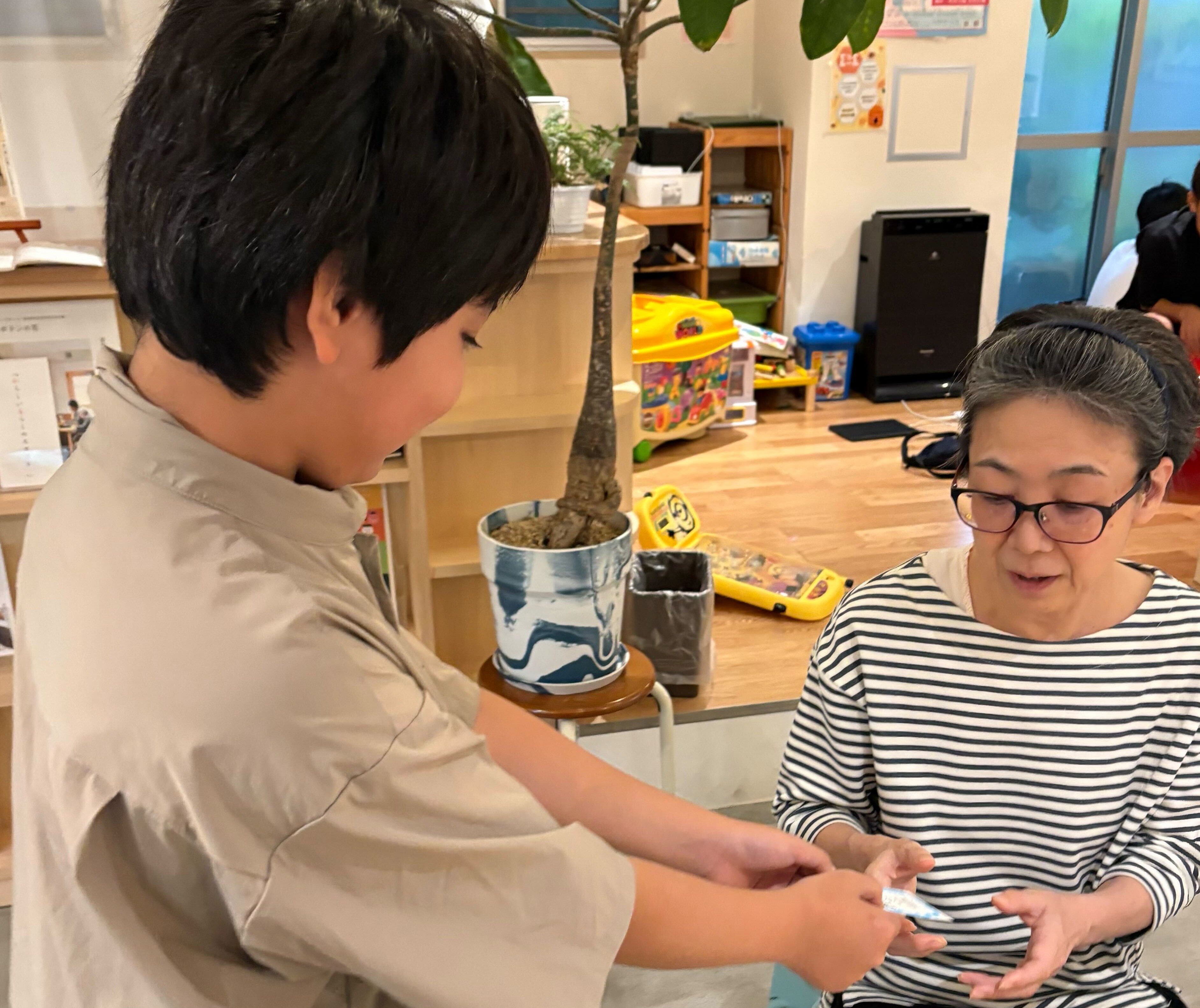 当法人では「一人一人の居場所づくり」を軸に、他にも介護施設や保育園などの事業を展開しています。多世代が来店する当カフェにおいては「もっとさまざまな世代の間で交流が生まれてほしい」という思いがあり、「トントン駄菓子サービス」を企画しました。券の表は、就労支援の障がいのあるメンバーが手書きで書いた感謝の言葉を。裏面は「肩たたき券」となっています。お客様が子どもに直接肩たたき券を渡すのはハードルが高いと考え、掲示ボードを設置します。いずれは「おばちゃん、肩たたこうか?」「ありがとう、ほなお願いね」「学校でうれしいことあってん、聞いてくれる?」といったコミュニケーションが生まれることを期待しています。