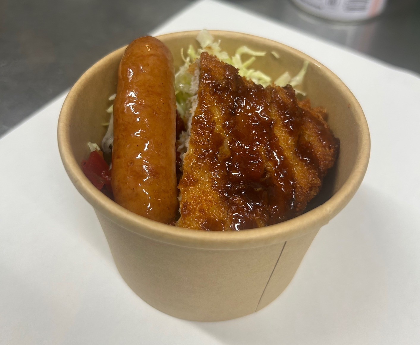 内容は、ご飯、カレーソース、ロースカツ/チキンカツ、シャウエッセン1本、キャベツ、福神漬け