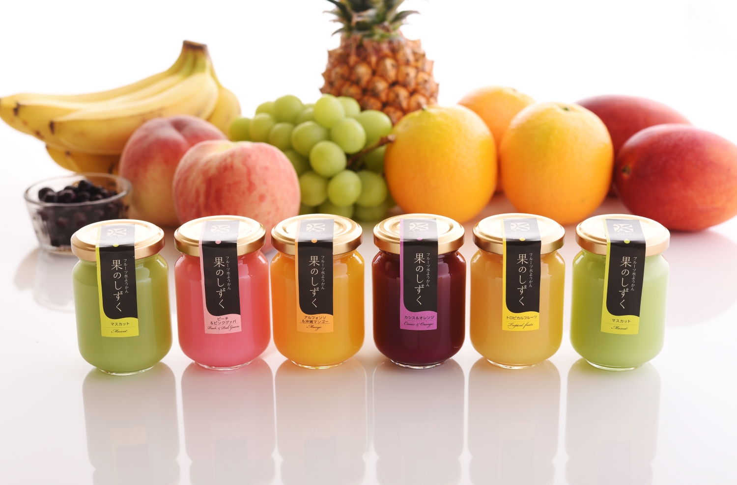 白桃やメロン、りんごなどフルーツそれぞれの果汁をたっぷり入れたゼリーです。まるで本物の果実のような可愛い容器にギュッと詰め込みました。