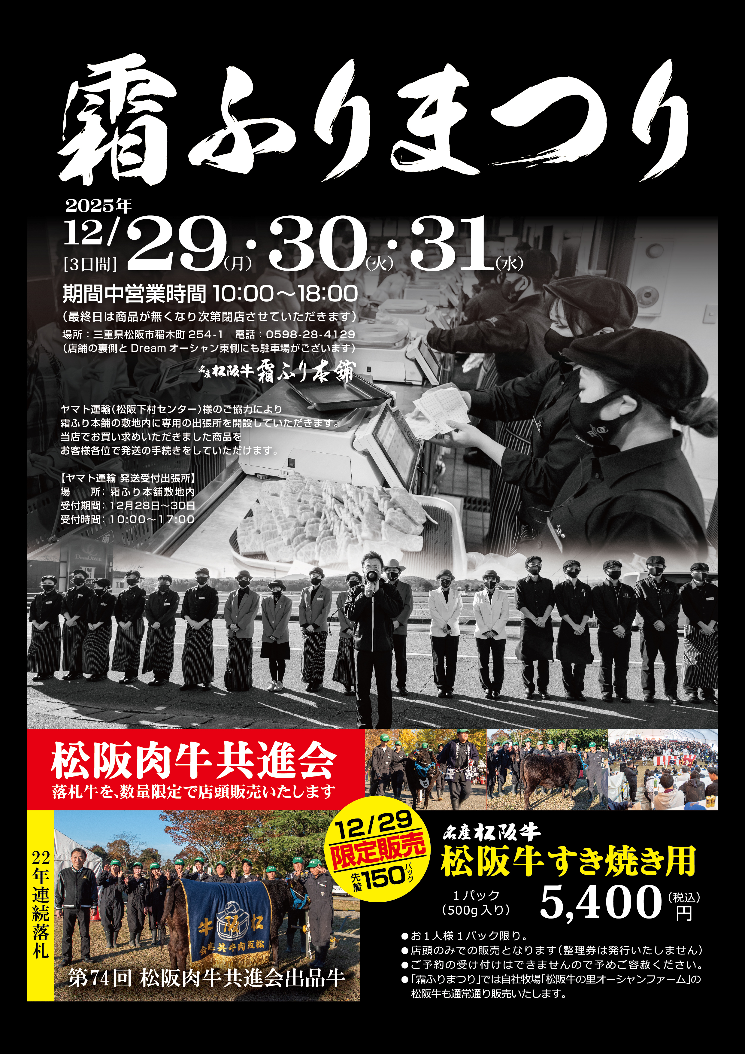 ※「霜ふりまつり」では自社牧場「松阪牛の里オーシャンファーム」の松阪牛も通常通り販売いたします。