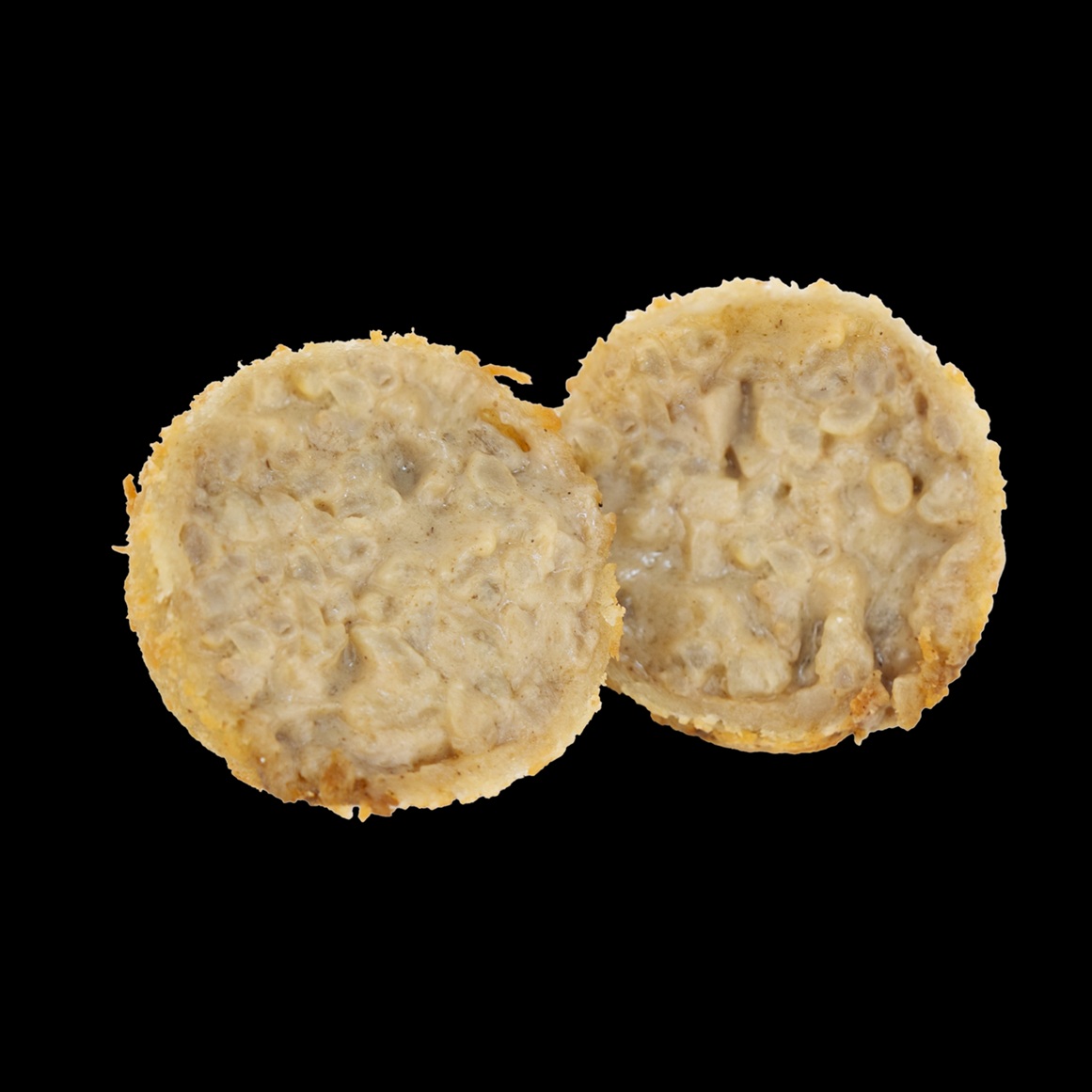フォアグラと鴨肉を混ぜ込んだクリームソース、黒胡椒を効かせたクリームソースを2層に重ね、まあるいフォルムに仕上げました。レギュラー商品でも使用しているこだわりのクリームソースは、生乳本来の風味やコクが特徴の「ノンホモ牛乳」を使った、濃厚なコクが特徴の特製クリームソースです。黒胡椒を効かせることで、フォアグラと鴨の香りや深みをより一層引き立たせます。濃厚で華やかな冬のご褒美を閉じ込めたクリームコロッケです。
