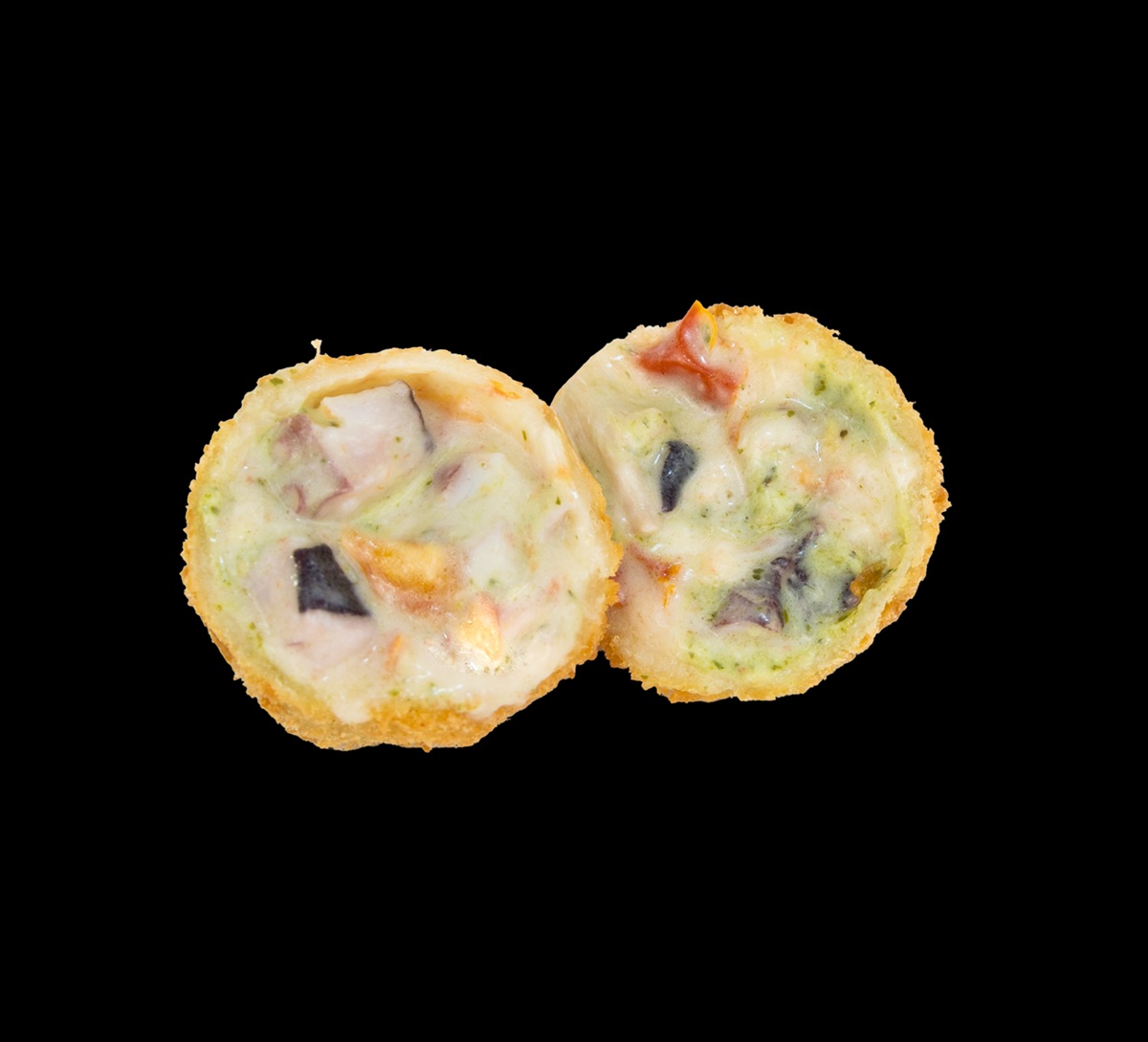 まあるい見た目が特徴のクリームコロッケです。トリュフやポルチーニなどの高級食材を使用し、小さめサイズでいろいろな味の食べ比べをお楽しみいただけます。フランス語で「溶ける」を意味するブランド名の「FONDANT」のように、電子レンジやトースターで温めると、中から特製クリームがとろりと溢れ出します。