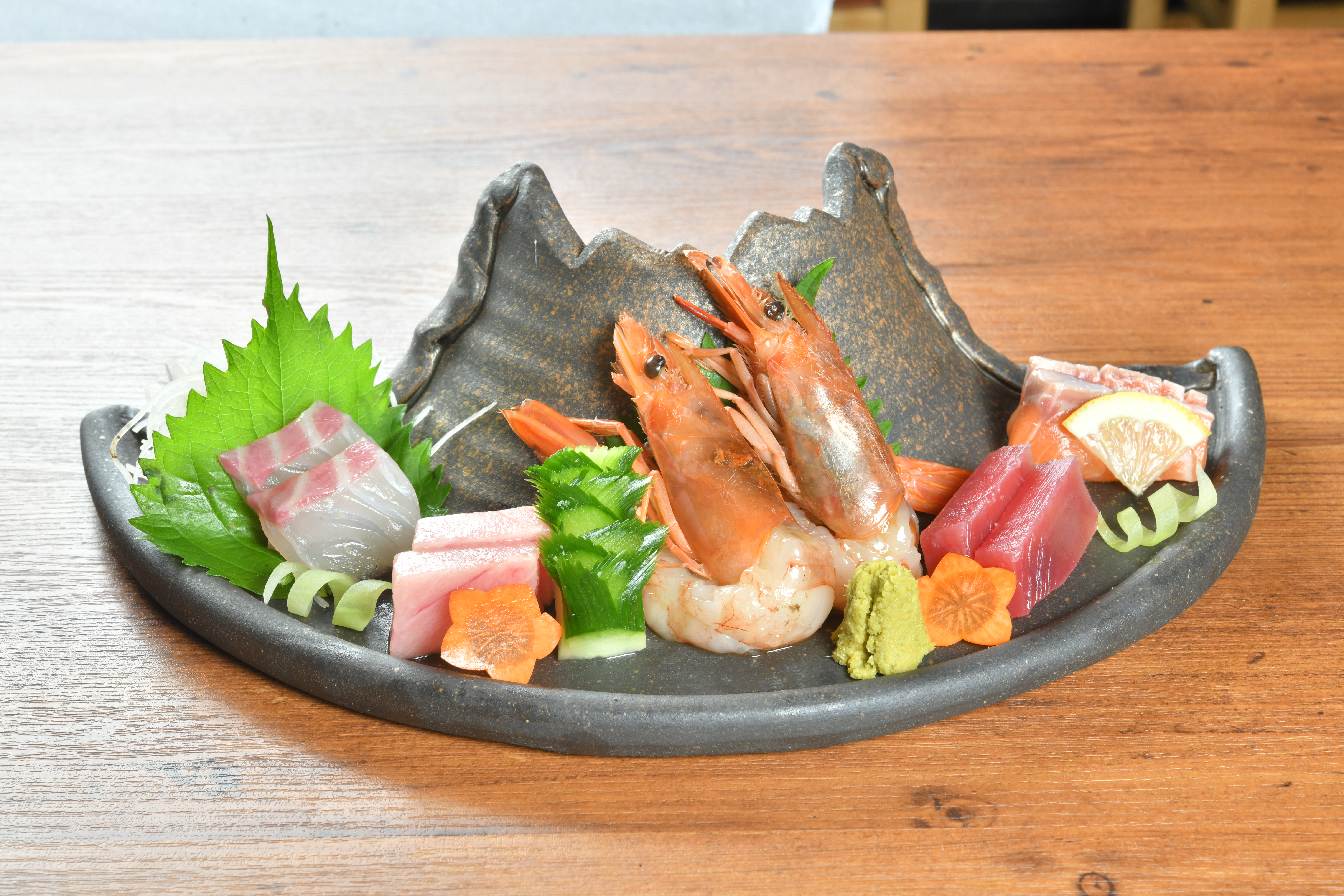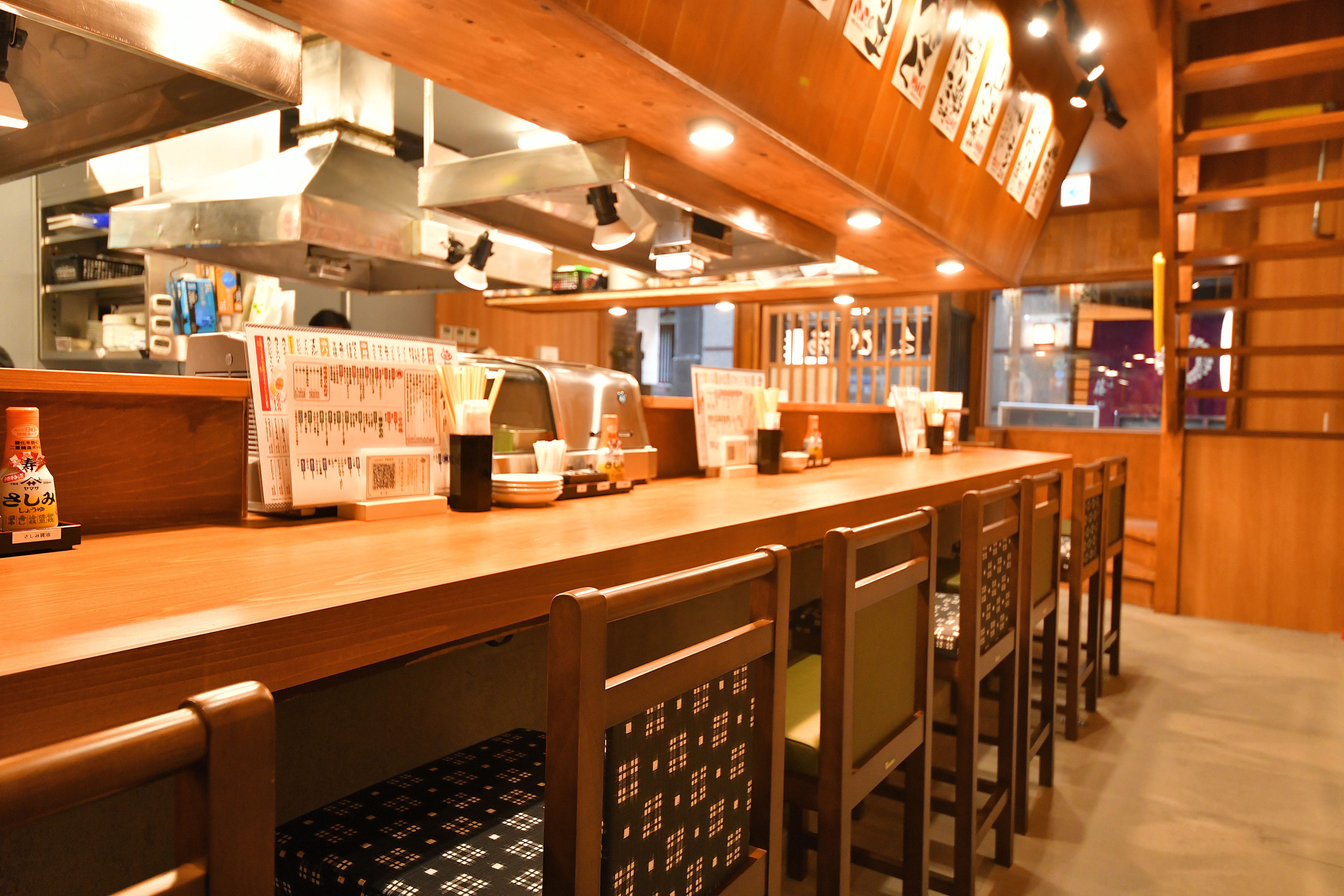 店内は、職人による調理を眺めながらお食事を楽しめるカウンター席が15席、団体様でもご利用いただけるテーブル席を73席ご用意しております。