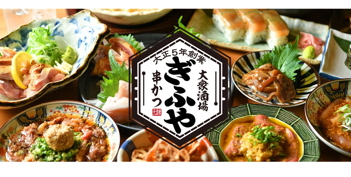大阪屈指の観光地「新世界」に本店を構える串かつの老舗“ぎふや”は、創業大正5年、本年で109年を迎えました。創業当時から受け継がれる串かつは、現在も全店共通の看板メニューとして多くのお客様に親しまれています。揚げたての串かつは、二度漬け厳禁の特製ソースはもちろん、さっぱりとしただし酢でもお楽しみいただけ、素材の旨味を存分にご堪能いただけます。