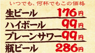 毎日気軽にお立ち寄りいただけるよう、ハイボール・サワーを90円~、生ビール160円、瓶ビール260円という衝撃的な価格でご提供いたします。