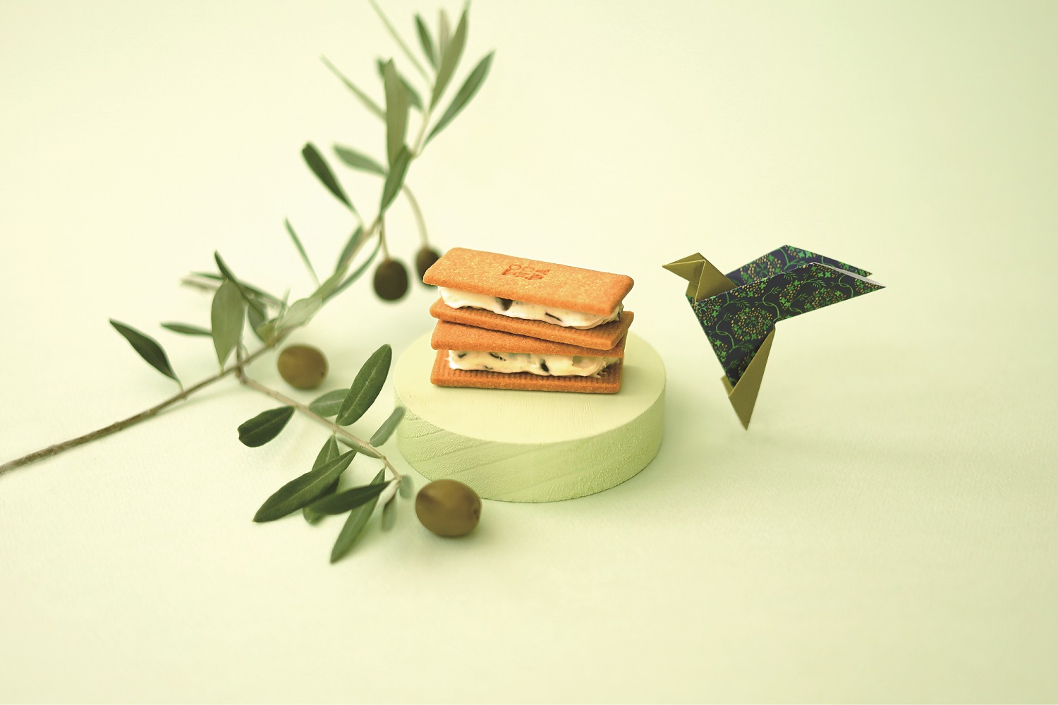 日本で初めてオリーブ栽培に成功した神戸の歴史に着想を得た一品で、若摘みグリーンオリーブの香りとホワイトチョコ入りバタークリームのコク、ほのかに香るジンが織りなす大人の味わいです。